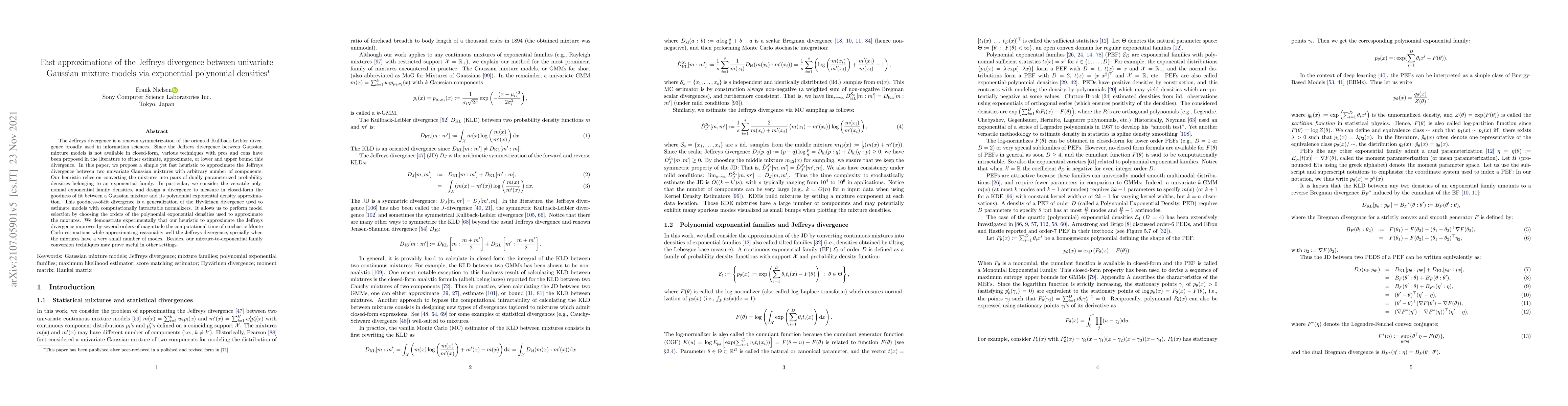 This paper proposes a heuristic to rapidly approximate the Jeffreys divergence between univariate Gaussian mixture models, transforming them into exponential polynomial densities for efficient computation. The method demonstrates significant speed improvements over stochastic Monte Carlo estimations while maintaining reasonable accuracy, especially for mixtures with few components.
