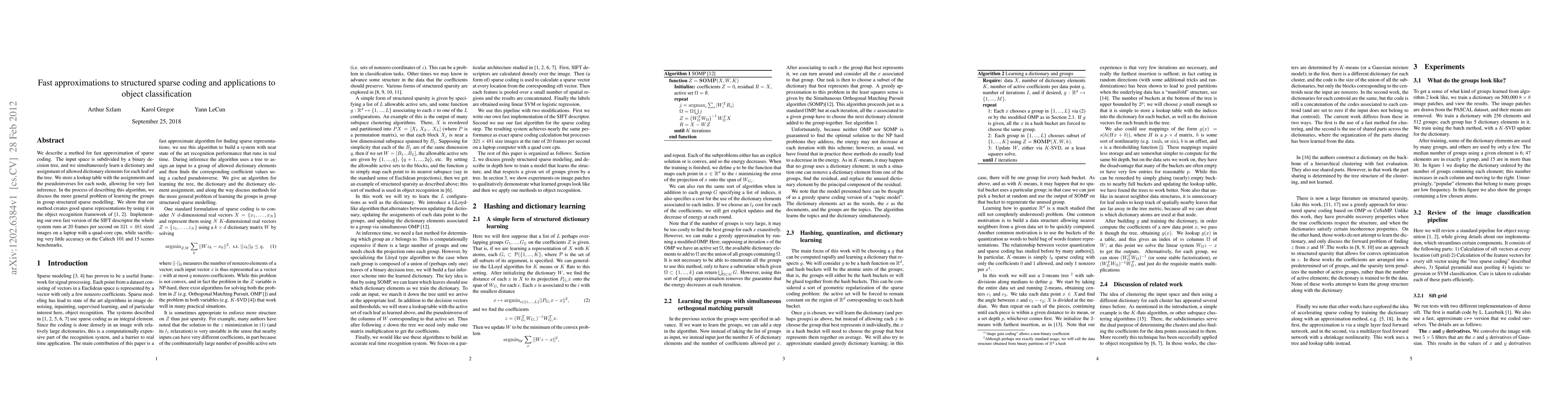 We describe a method for fast approximation of sparse coding. The input space is subdivided by a binary decision tree, and we simultaneously learn a dictionary and assignment of allowed dictionary elements for each leaf of the tree. We store a lookup table with the assignments and the pseudoinverses for each node, allowing for very fast inference. We give an algorithm for learning the tree, the dictionary and the dictionary element assignment, and In the process of describing this algorithm, we discuss the more general problem of learning the groups in group structured sparse modelling. We show that our method creates good sparse representations by using it in the object recognition framework of \cite{lazebnik06,yang-cvpr-09}. Implementing our own fast version of the SIFT descriptor the whole system runs at 20 frames per second on $321 \times 481$ sized images on a laptop with a quad-core cpu, while sacrificing very little accuracy on the Caltech 101 and 15 scenes benchmarks.