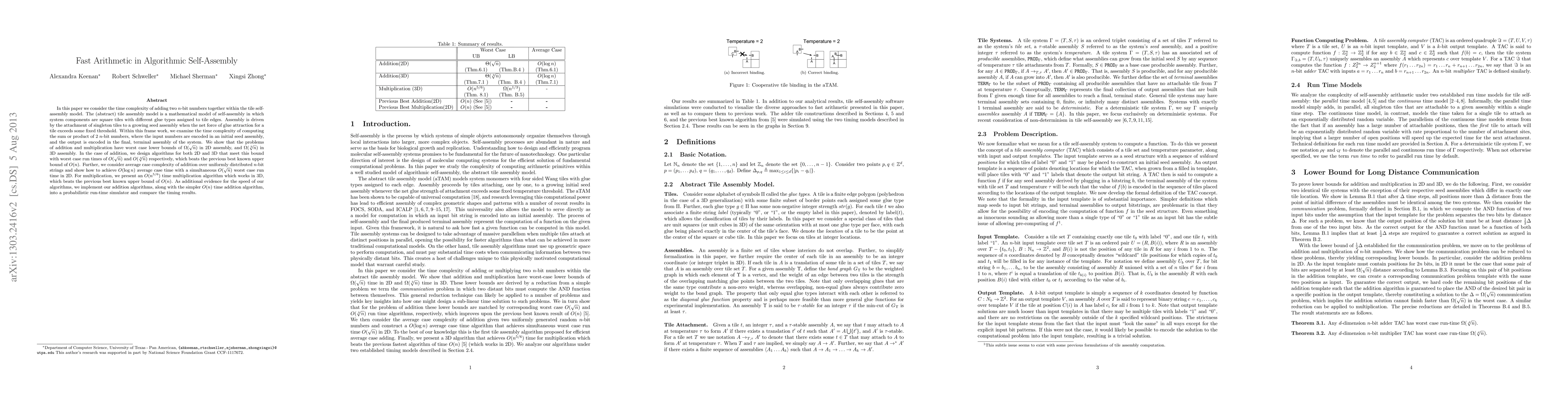 In this paper we consider the time complexity of computing the sum and product of two $n$-bit numbers within the tile self-assembly model. The (abstract) tile assembly model is a mathematical model of self-assembly in which system components are square tiles with different glue types assigned to tile edges. Assembly is driven by the attachment of singleton tiles to a growing seed assembly when the net force of glue attraction for a tile exceeds some fixed threshold. Within this frame work, we examine the time complexity of computing the sum or product of 2 n-bit numbers, where the input numbers are encoded in an initial seed assembly, and the output is encoded in the final, terminal assembly of the system. We show that the problems of addition and multiplication have worst case lower bounds of $\Omega(\sqrt{n})$ in 2D assembly, and $\Omega(\sqrt[3]{n})$ in 3D assembly. In the case of addition, we design algorithms for both 2D and 3D that meet this bound with worst case run times of $O(\sqrt{n})$ and $O(\sqrt[3]{n})$ respectively, which beats the previous best known upper bound of O(n). Further, we consider average case complexity of addition over uniformly distributed n-bit strings and show how to achieve $O(\log n)$ average case time with a simultaneous $O(\sqrt{n})$ worst case run time in 2D. For multiplication, we present an $O(n^{5/6})$ time multiplication algorithm which works in 3D, which beats the previous best known upper bound of O(n). As additional evidence for the speed of our algorithms, we implement our addition algorithms, along with the simpler O(n) time addition algorithm, into a probabilistic run-time simulator and compare the timing results.