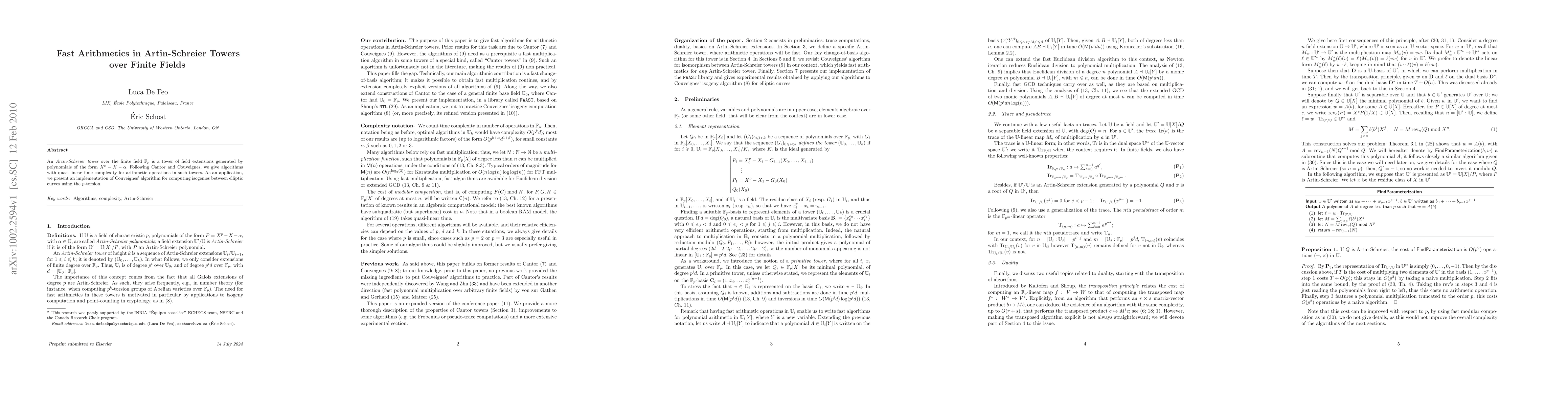 Summary: This paper presents quasi-linear time algorithms for arithmetic operations in Artin-Schreier towers over finite fields, with an implementation of Couveignes' algorithm for computing isogenies between elliptic curves utilizing p-torsion.