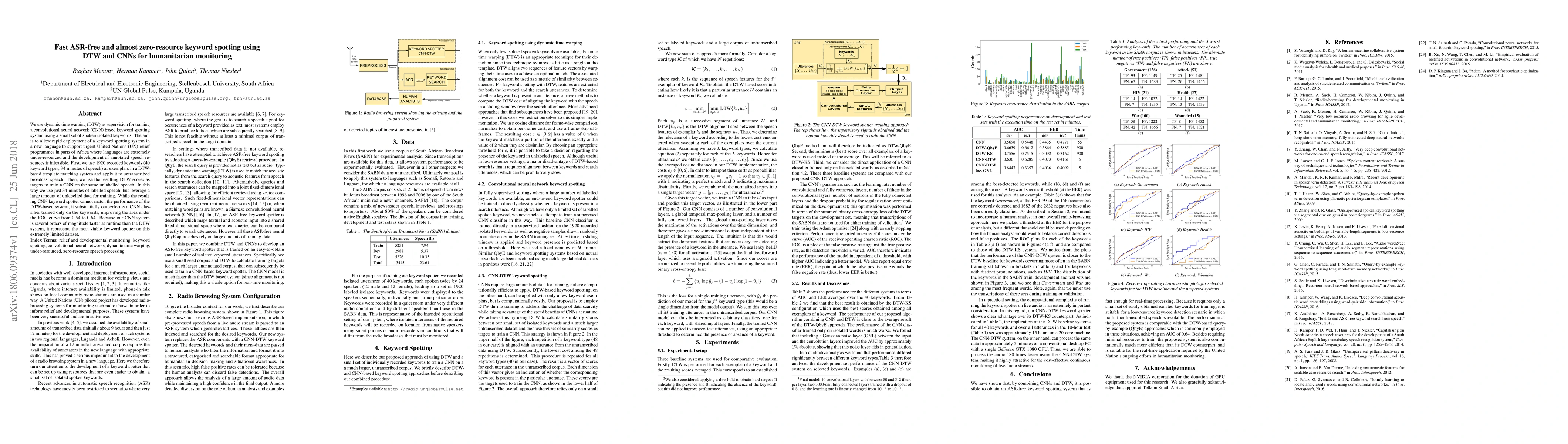 This paper proposes a fast, resource-efficient keyword spotting system using DTW-supervised CNNs for humanitarian monitoring in under-resourced African languages. The approach leverages minimal labelled data and large amounts of unlabelled speech to achieve a faster, albeit less accurate, keyword spotting system compared to traditional DTW methods.
