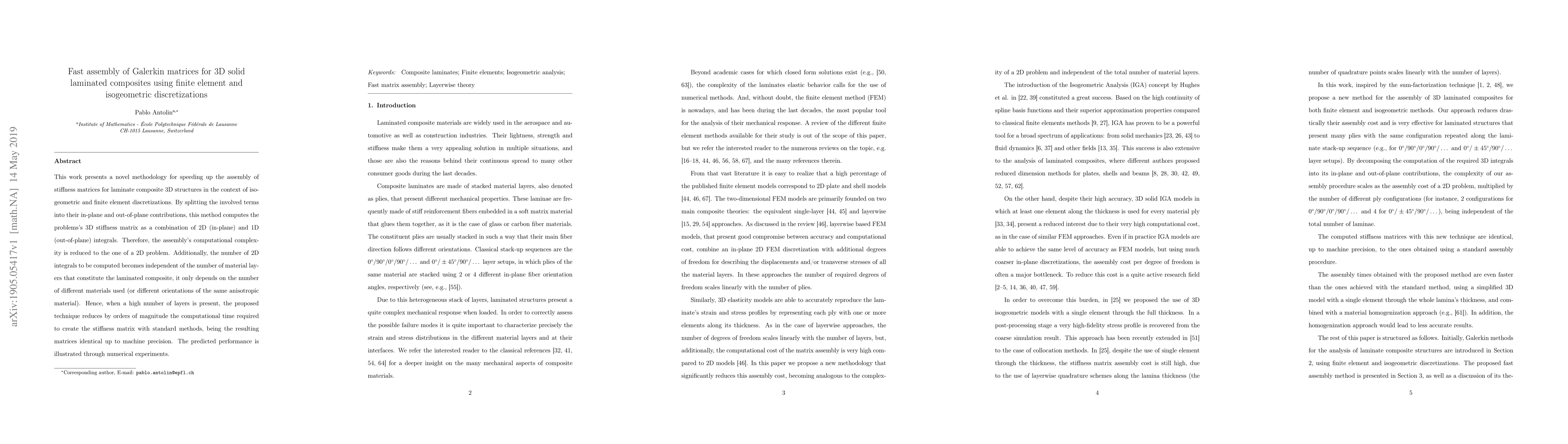 This work presents a novel methodology for speeding up the assembly of stiffness matrices for laminate composite 3D structures in the context of isogeometric and finite element discretizations. By splitting the involved terms into their in-plane and out-of-plane contributions, this method computes the problems's 3D stiffness matrix as a combination of 2D (in-plane) and 1D (out-of-plane) integrals. Therefore, the assembly's computational complexity is reduced to the one of a 2D problem. Additionally, the number of 2D integrals to be computed becomes independent of the number of material layers that constitute the laminated composite, it only depends on the number of different materials used (or different orientations of the same anisotropic material). Hence, when a high number of layers is present, the proposed technique reduces by orders of magnitude the computational time required to create the stiffness matrix with standard methods, being the resulting matrices identical up to machine precision. The predicted performance is illustrated through numerical experiments.
