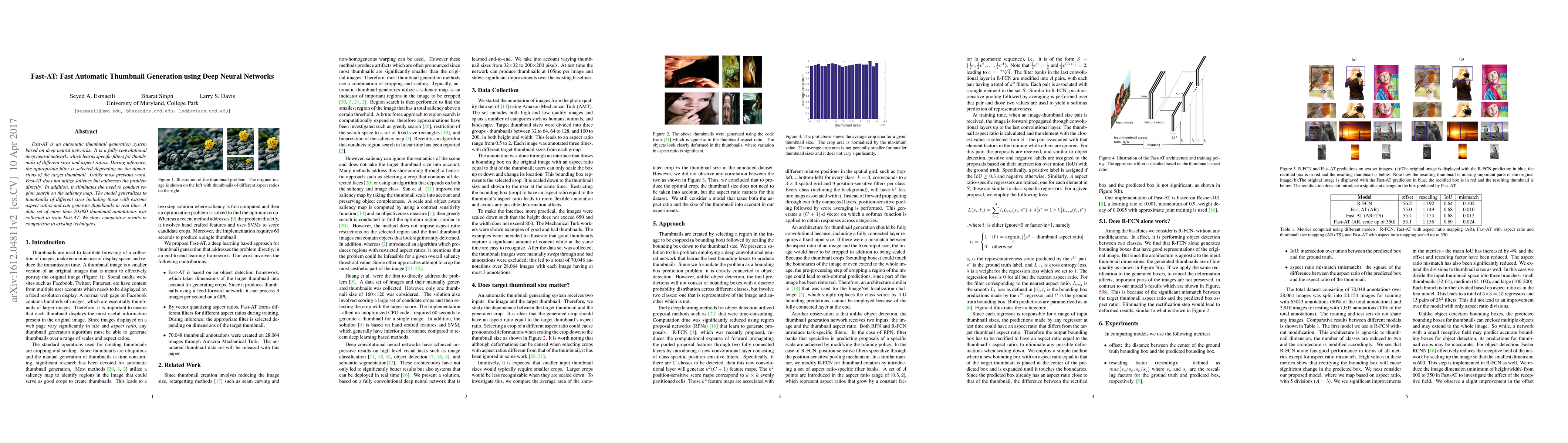 Fast-AT employs a fully-convolutional deep neural network for real-time automatic thumbnail generation without relying on saliency maps, achieving competitive results compared to existing methods. The model generalizes to various thumbnail sizes and aspect ratios using learned filters.