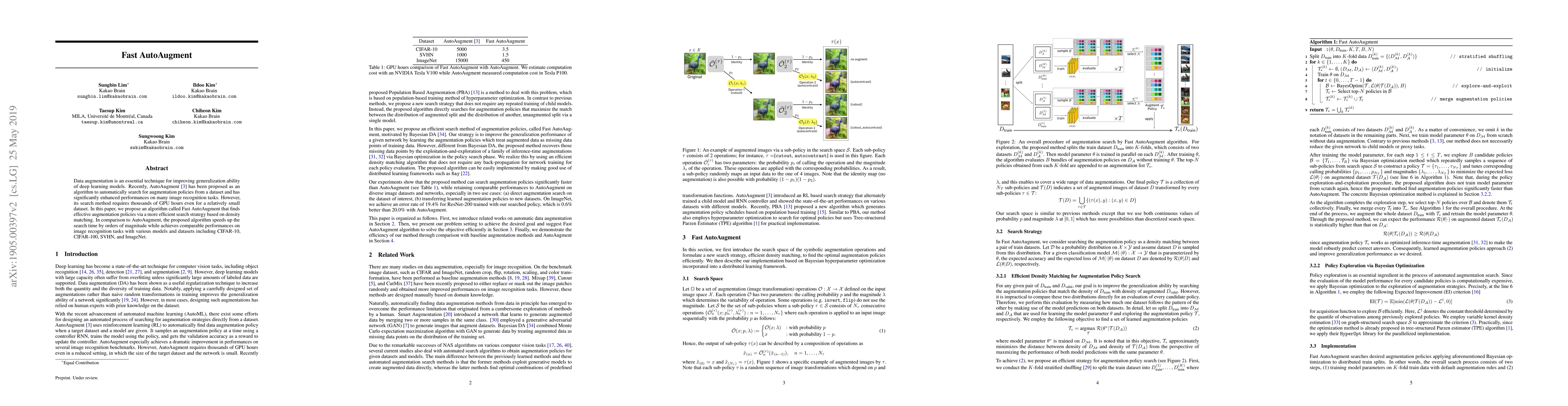Fast AutoAugment introduces a more efficient search strategy based on density matching to significantly reduce the time required to find effective data augmentation policies compared to AutoAugment, achieving comparable performance improvements on various image recognition tasks.