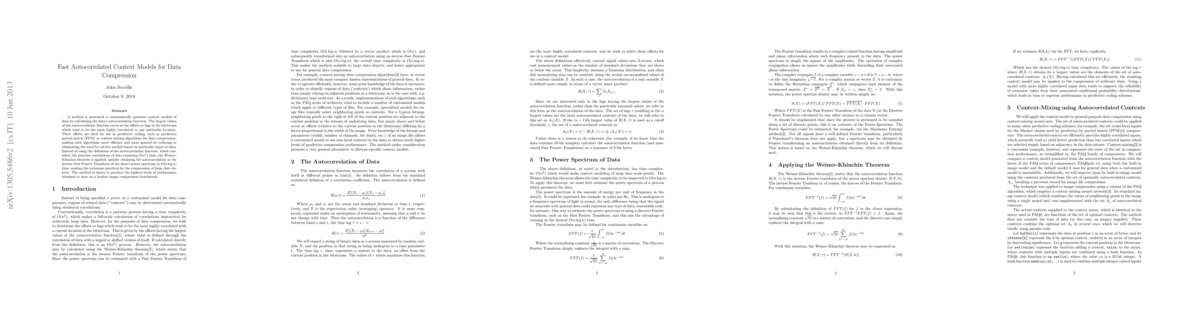 A method is presented to automatically generate context models of data by calculating the data's autocorrelation function. The largest values of the autocorrelation function occur at the offsets or lags in the bitstream which tend to be the most highly correlated to any particular location. These offsets are ideal for use in predictive coding, such as predictive partial match (PPM) or context-mixing algorithms for data compression, making such algorithms more efficient and more general by reducing or eliminating the need for ad-hoc models based on particular types of data. Instead of using the definition of the autocorrelation function, which considers the pairwise correlations of data requiring O(n^2) time, the Weiner-Khinchin theorem is applied, quickly obtaining the autocorrelation as the inverse Fast Fourier transform of the data's power spectrum in O(n log n) time, making the technique practical for the compression of large data objects. The method is shown to produce the highest levels of performance obtained to date on a lossless image compression benchmark.