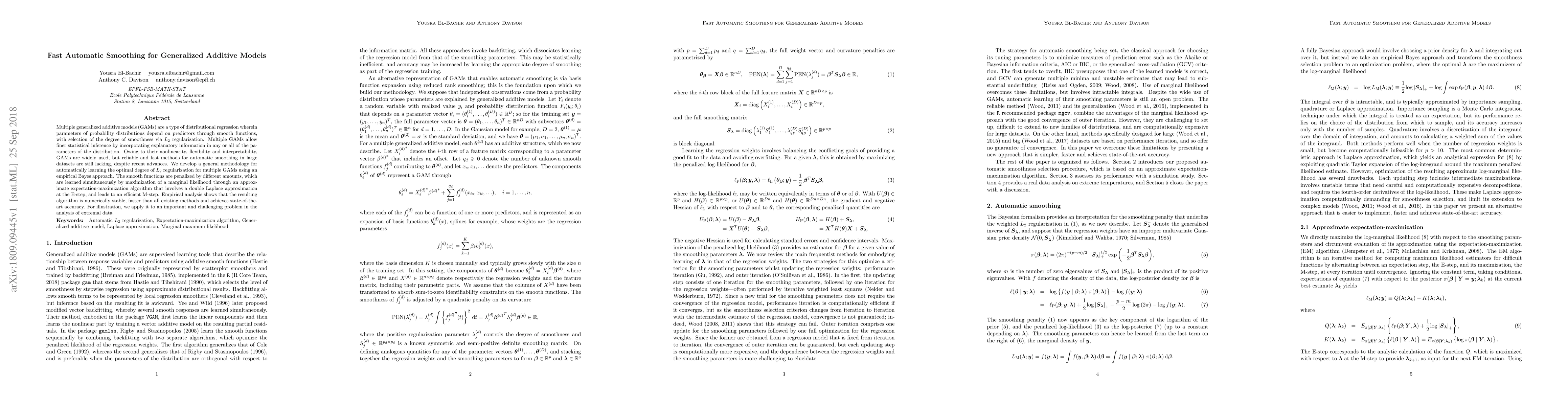 Multiple generalized additive models (GAMs) are a type of distributional regression wherein parameters of probability distributions depend on predictors through smooth functions, with selection of the degree of smoothness via $L_2$ regularization. Multiple GAMs allow finer statistical inference by incorporating explanatory information in any or all of the parameters of the distribution. Owing to their nonlinearity, flexibility and interpretability, GAMs are widely used, but reliable and fast methods for automatic smoothing in large datasets are still lacking, despite recent advances. We develop a general methodology for automatically learning the optimal degree of $L_2$ regularization for multiple GAMs using an empirical Bayes approach. The smooth functions are penalized by different amounts, which are learned simultaneously by maximization of a marginal likelihood through an approximate expectation-maximization algorithm that involves a double Laplace approximation at the E-step, and leads to an efficient M-step. Empirical analysis shows that the resulting algorithm is numerically stable, faster than all existing methods and achieves state-of-the-art accuracy. For illustration, we apply it to an important and challenging problem in the analysis of extremal data.