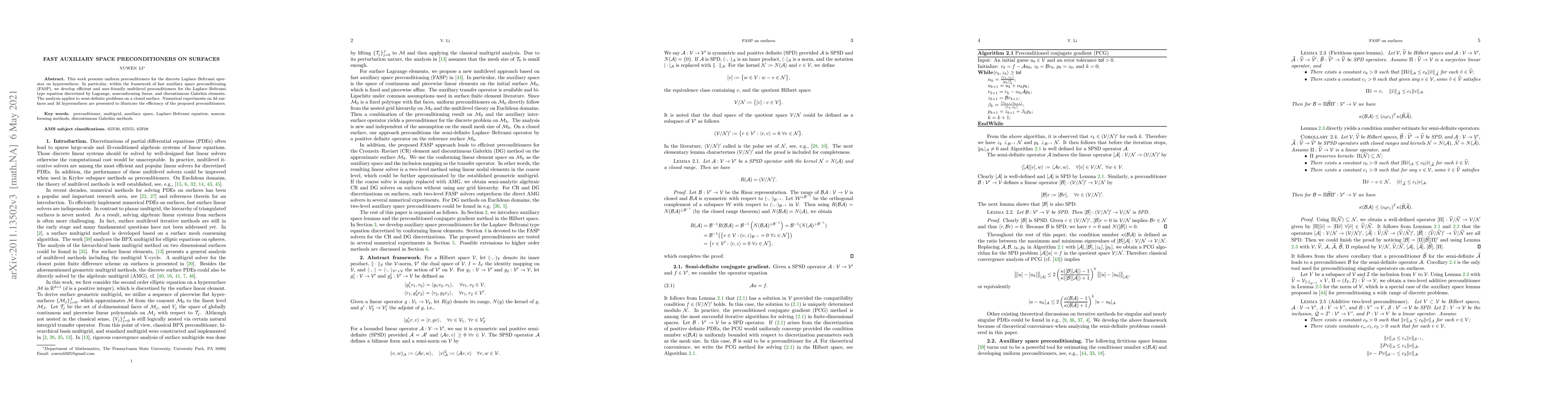 This work presents uniform preconditioners for the discrete Laplace--Beltrami operator on hypersurfaces. In particular, within the framework of fast auxiliary space preconditioning (FASP), we develop efficient and user-friendly multilevel preconditioners for the Laplace--Beltrami type equation discretized by Lagrange, nonconforming linear, and discontinuous Galerkin elements. The analysis applies to semi-definite problems on a closed surface. Numerical experiments on 2d surfaces and 3d hypersurfaces are presented to illustrate the efficiency of the proposed preconditioners.