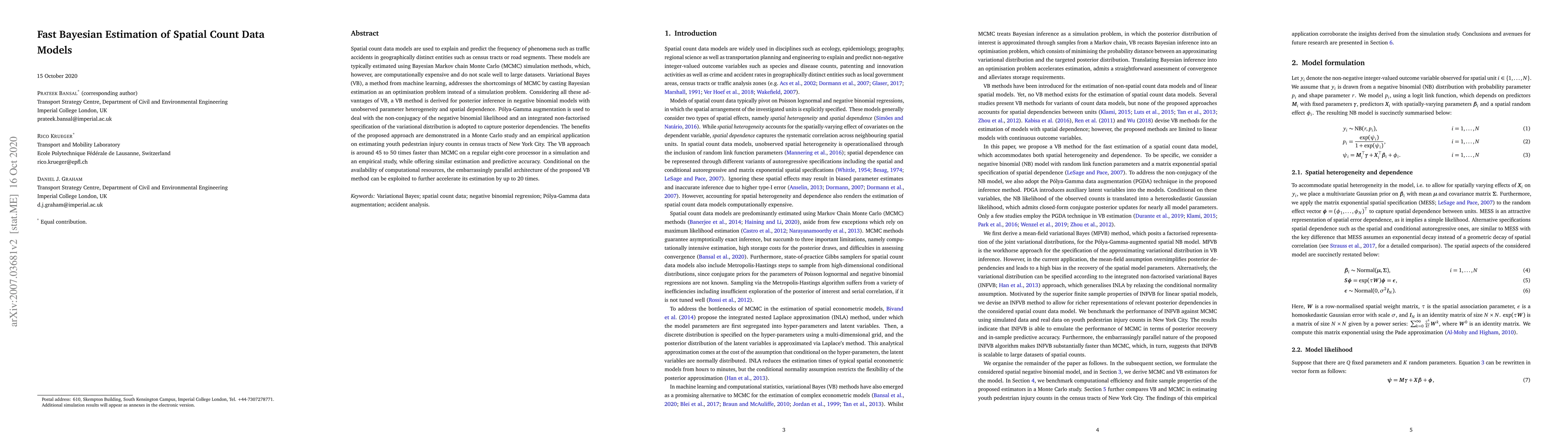 Spatial count data models are used to explain and predict the frequency of phenomena such as traffic accidents in geographically distinct entities such as census tracts or road segments. These models are typically estimated using Bayesian Markov chain Monte Carlo (MCMC) simulation methods, which, however, are computationally expensive and do not scale well to large datasets. Variational Bayes (VB), a method from machine learning, addresses the shortcomings of MCMC by casting Bayesian estimation as an optimisation problem instead of a simulation problem. Considering all these advantages of VB, a VB method is derived for posterior inference in negative binomial models with unobserved parameter heterogeneity and spatial dependence. P\'olya-Gamma augmentation is used to deal with the non-conjugacy of the negative binomial likelihood and an integrated non-factorised specification of the variational distribution is adopted to capture posterior dependencies. The benefits of the proposed approach are demonstrated in a Monte Carlo study and an empirical application on estimating youth pedestrian injury counts in census tracts of New York City. The VB approach is around 45 to 50 times faster than MCMC on a regular eight-core processor in a simulation and an empirical study, while offering similar estimation and predictive accuracy. Conditional on the availability of computational resources, the embarrassingly parallel architecture of the proposed VB method can be exploited to further accelerate its estimation by up to 20 times.