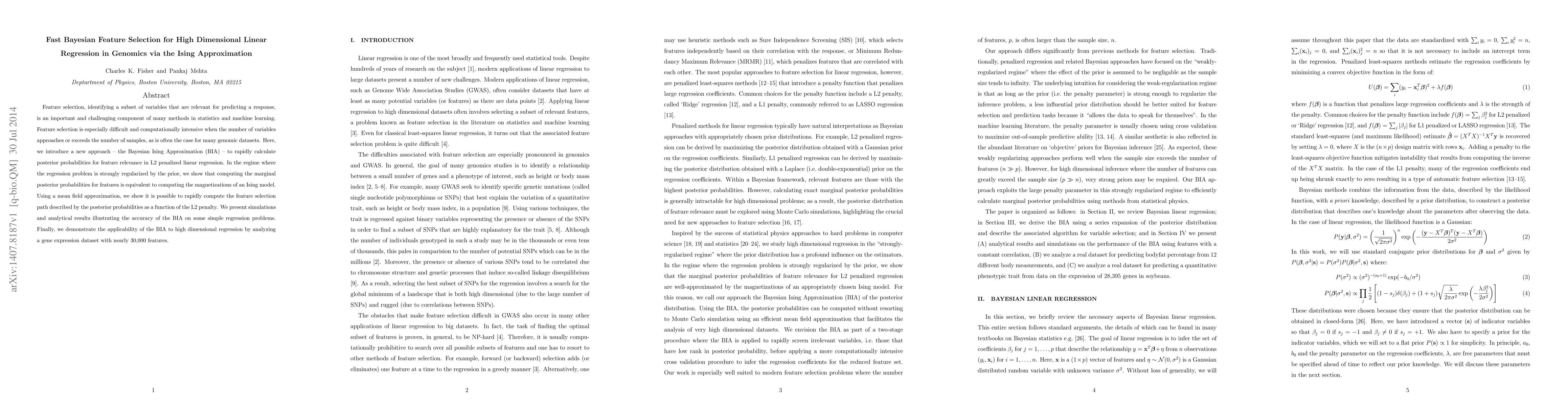 This paper introduces a Bayesian Ising Approximation (BIA) for fast feature selection in high-dimensional linear regression, particularly in genomics. The BIA leverages an Ising model to efficiently compute posterior probabilities for feature relevance, enabling rapid computation of the feature selection path under L2 regularization.