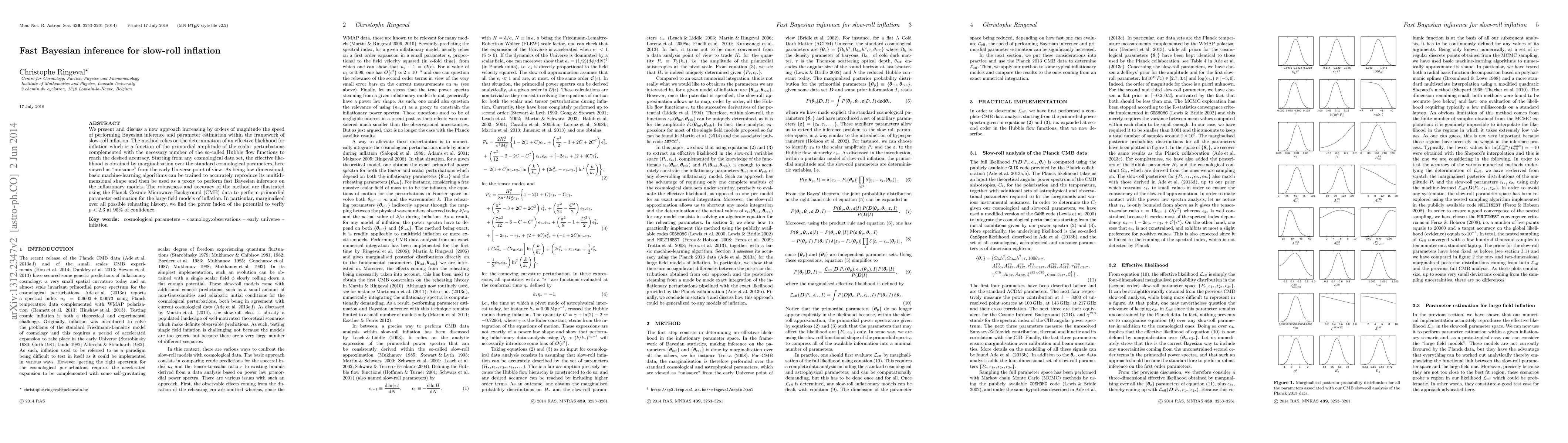 We present and discuss a new approach increasing by orders of magnitude the speed of performing Bayesian inference and parameter estimation within the framework of slow-roll inflation. The method relies on the determination of an effective likelihood for inflation which is a function of the primordial amplitude of the scalar perturbations complemented with the necessary number of the so-called Hubble flow functions to reach the desired accuracy. Starting from any cosmological data set, the effective likelihood is obtained by marginalisation over the standard cosmological parameters, here viewed as "nuisance" from the early Universe point of view. As being low-dimensional, basic machine-learning algorithms can be trained to accurately reproduce its multidimensional shape and then be used as a proxy to perform fast Bayesian inference on the inflationary models. The robustness and accuracy of the method are illustrated using the Planck Cosmic Microwave Background (CMB) data to perform primordial parameter estimation for the large field models of inflation. In particular, marginalised over all possible reheating history, we find the power index of the potential to verify p < 2.3 at 95% of confidence.