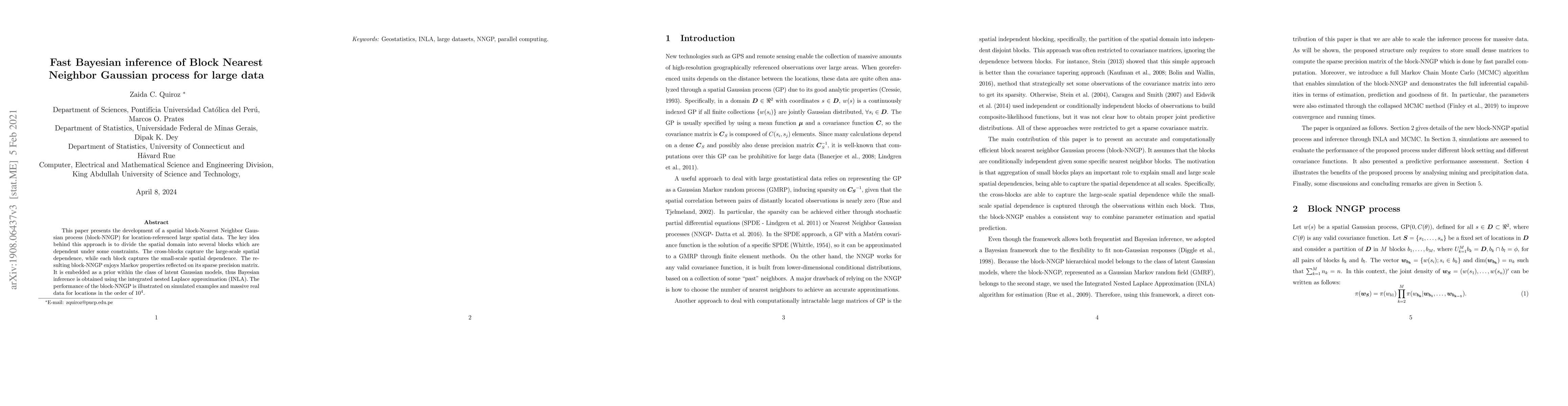 This paper develops a spatial block-Nearest Neighbor Gaussian process (block-NNGP) for large spatial data, dividing the domain into blocks to capture both large-scale and small-scale spatial dependencies. Bayesian inference is performed using integrated nested Laplace approximation (INLA).