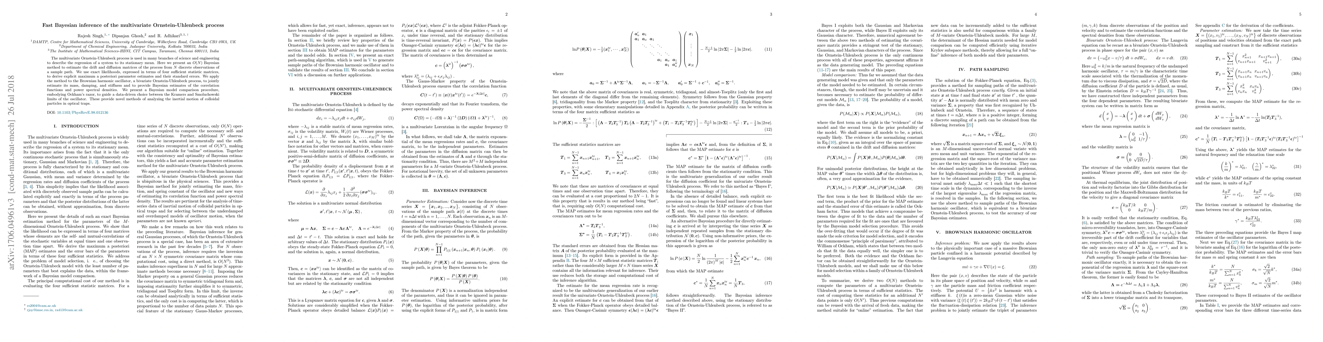 The multivariate Ornstein-Uhlenbeck process is used in many branches of science and engineering to describe the regression of a system to its stationary mean. Here we present an $O(N)$ Bayesian method to estimate the drift and diffusion matrices of the process from $N$ discrete observations of a sample path. We use exact likelihoods, expressed in terms of four sufficient statistic matrices, to derive explicit maximum a posteriori parameter estimates and their standard errors. We apply the method to the Brownian harmonic oscillator, a bivariate Ornstein-Uhlenbeck process, to jointly estimate its mass, damping, and stiffness and to provide Bayesian estimates of the correlation functions and power spectral densities. We present a Bayesian model comparison procedure, embodying Ockham's razor, to guide a data-driven choice between the Kramers and Smoluchowski limits of the oscillator. These provide novel methods of analyzing the inertial motion of colloidal particles in optical traps.