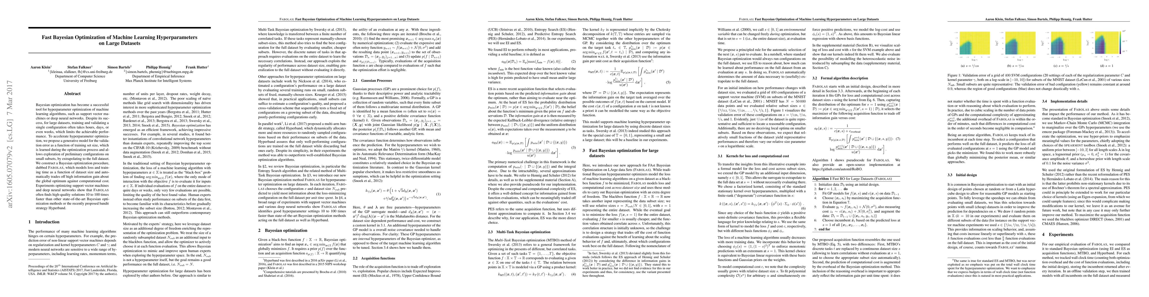 A new Bayesian optimization method called Fabolas accelerates hyperparameter tuning for machine learning models on large datasets by extrapolating to full datasets from smaller subsets, leading to 10-100x faster results than current methods.