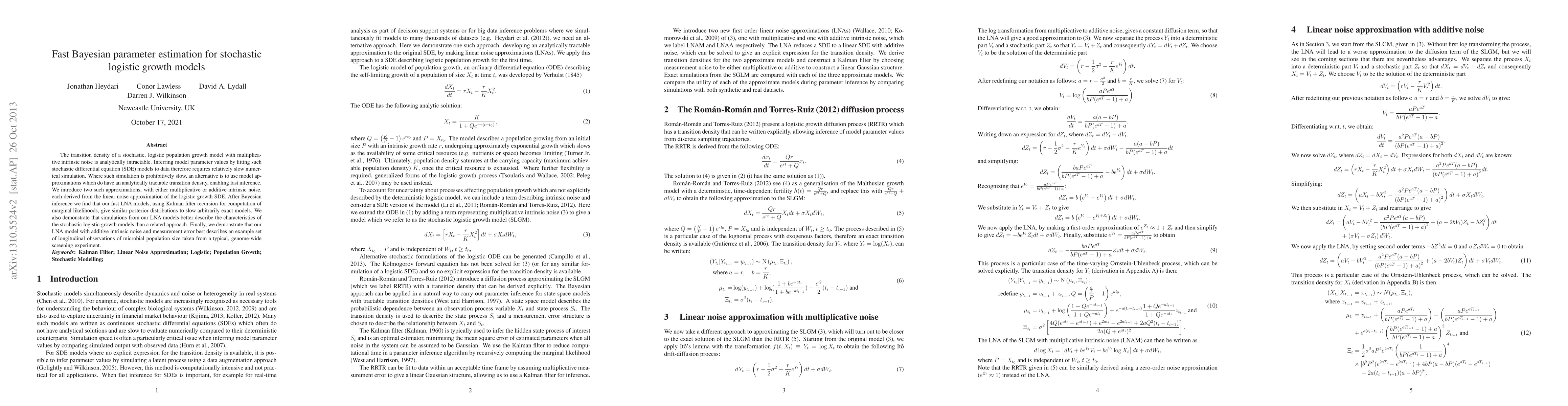 The transition density of a stochastic, logistic population growth model with multiplicative intrinsic noise is analytically intractable. Inferring model parameter values by fitting such stochastic differential equation (SDE) models to data therefore requires relatively slow numerical simulation. Where such simulation is prohibitively slow, an alternative is to use model approximations which do have an analytically tractable transition density, enabling fast inference. We introduce two such approximations, with either multiplicative or additive intrinsic noise, each derived from the linear noise approximation of the logistic growth SDE. After Bayesian inference we find that our fast LNA models, using Kalman filter recursion for computation of marginal likelihoods, give similar posterior distributions to slow arbitrarily exact models. We also demonstrate that simulations from our LNA models better describe the characteristics of the stochastic logistic growth models than a related approach. Finally, we demonstrate that our LNA model with additive intrinsic noise and measurement error best describes an example set of longitudinal observations of microbial population size taken from a typical, genome-wide screening experiment.