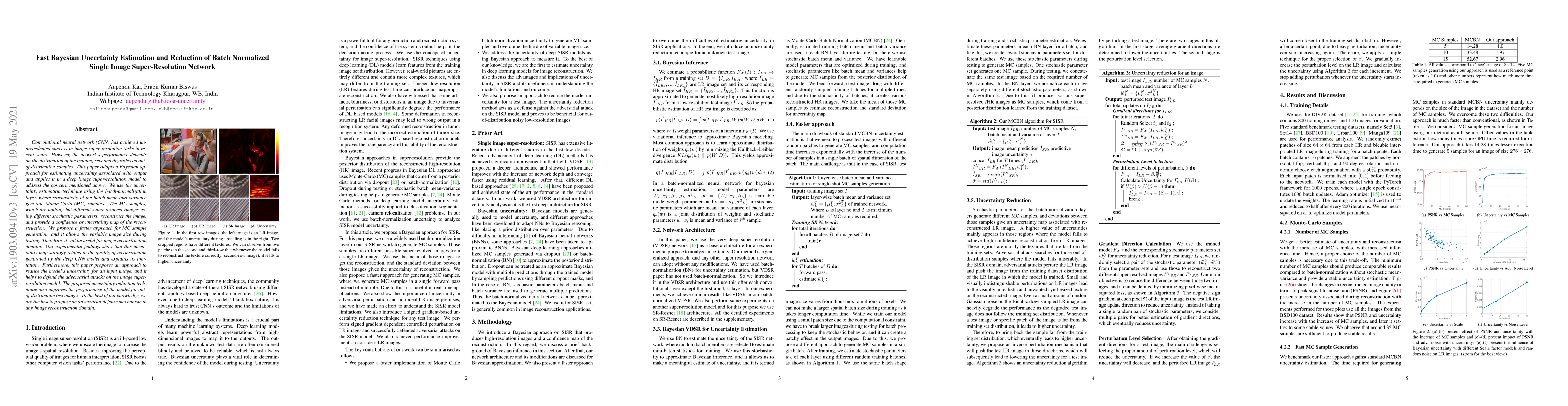 Convolutional neural network (CNN) has achieved unprecedented success in image super-resolution tasks in recent years. However, the network's performance depends on the distribution of the training sets and degrades on out-of-distribution samples. This paper adopts a Bayesian approach for estimating uncertainty associated with output and applies it in a deep image super-resolution model to address the concern mentioned above. We use the uncertainty estimation technique using the batch-normalization layer, where stochasticity of the batch mean and variance generate Monte-Carlo (MC) samples. The MC samples, which are nothing but different super-resolved images using different stochastic parameters, reconstruct the image, and provide a confidence or uncertainty map of the reconstruction. We propose a faster approach for MC sample generation, and it allows the variable image size during testing. Therefore, it will be useful for image reconstruction domain. Our experimental findings show that this uncertainty map strongly relates to the quality of reconstruction generated by the deep CNN model and explains its limitation. Furthermore, this paper proposes an approach to reduce the model's uncertainty for an input image, and it helps to defend the adversarial attacks on the image super-resolution model. The proposed uncertainty reduction technique also improves the performance of the model for out-of-distribution test images. To the best of our knowledge, we are the first to propose an adversarial defense mechanism in any image reconstruction domain.