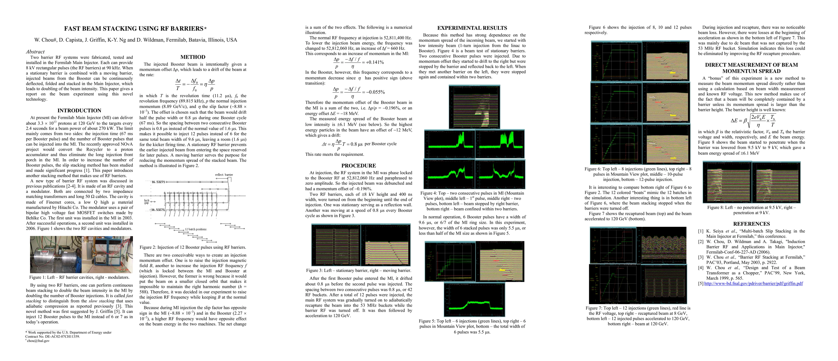Two barrier RF systems were fabricated, tested and installed in the Fermilab Main Injector. Each can provide 8 kV rectangular pulses (the RF barriers) at 90 kHz. When a stationary barrier is combined with a moving barrier, injected beams from the Booster can be continuously deflected, folded and stacked in the Main Injector, which leads to doubling of the beam intensity. This paper gives a report on the beam experiment using this novel technology.