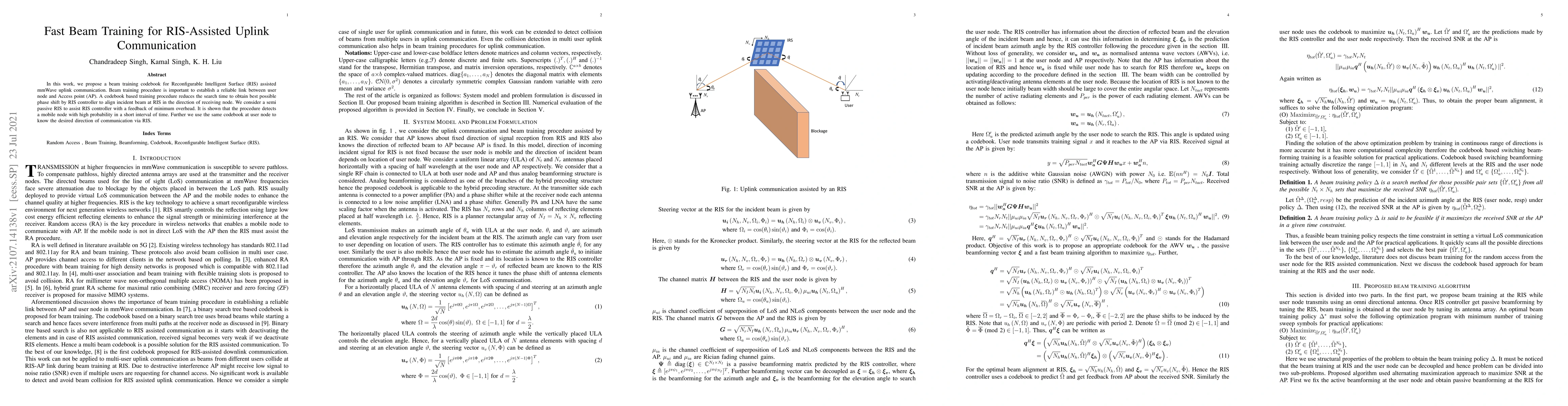 The paper proposes a codebook-based beam training method for RIS-assisted mmWave uplink communication to quickly determine the best phase shift for reliable links, using a semi-passive RIS with minimal feedback overhead to detect mobile nodes efficiently. The same codebook aids in identifying the desired communication direction via the RIS.