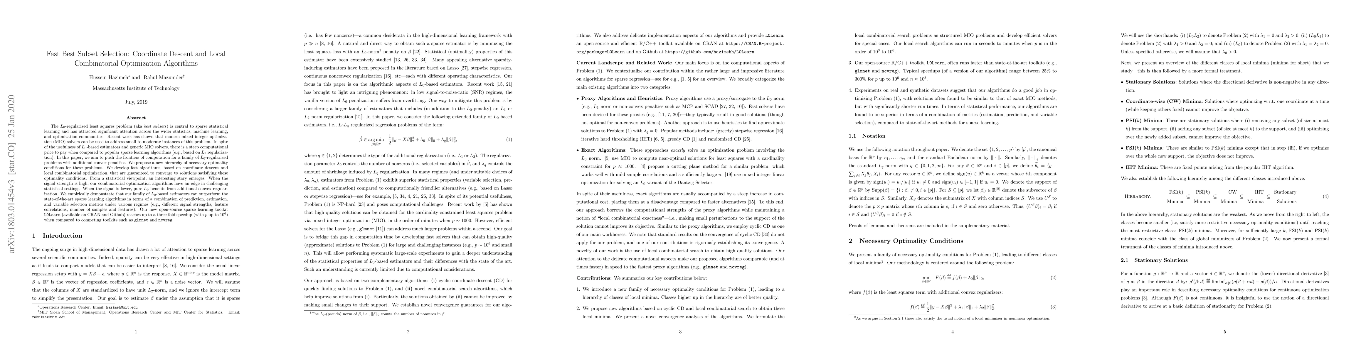 This paper proposes fast algorithms for best subset selection using $L_0$-regularization, leveraging coordinate descent and local combinatorial optimization. The new methods outperform state-of-the-art sparse learning algorithms in prediction, estimation, and variable selection, especially under high signal strength, and are implemented in the open-source toolkit L0Learn.