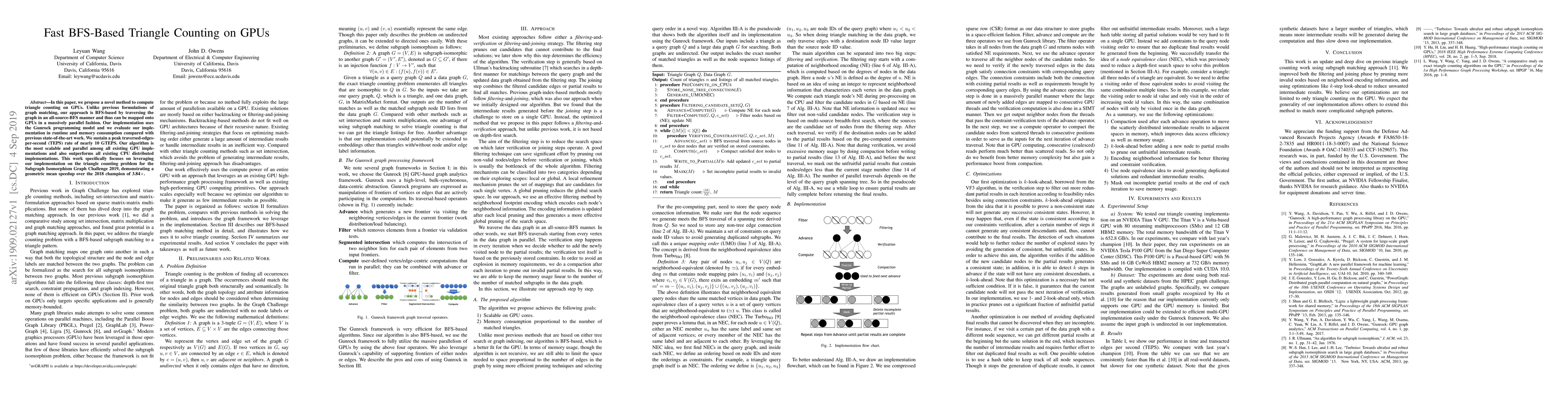 This paper introduces a BFS-based GPU method for efficient triangle counting, achieving nearly 10 GTEPS and outperforming previous GPU and CPU implementations. The method leverages the Gunrock model and demonstrates a 3.84x speedup over the 2018 champion in the Subgraph Isomorphism Graph Challenge 2019.