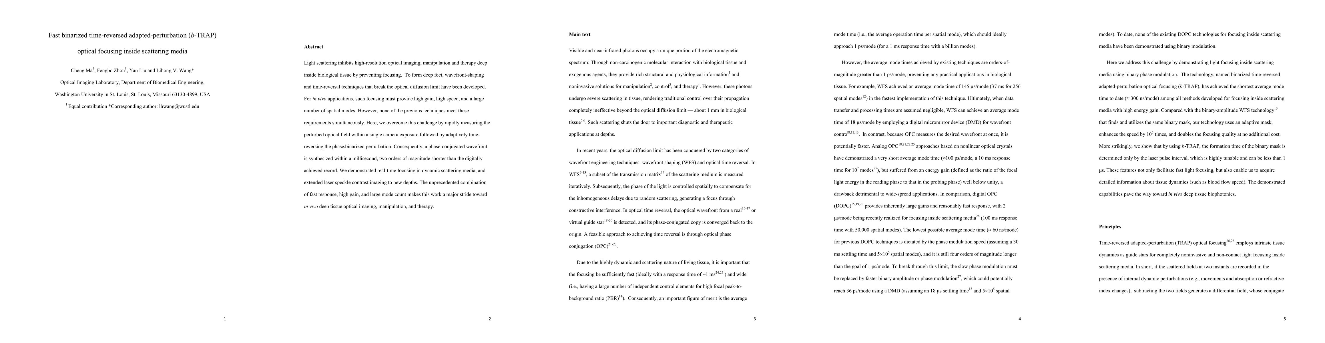 This paper introduces a fast binarized time-reversed adapted-perturbation (b-TRAP) optical focusing technique that significantly enhances deep tissue imaging in scattering media. The method achieves rapid wavefront shaping within milliseconds, providing high gain, speed, and multiple spatial modes, thus overcoming limitations of previous techniques.