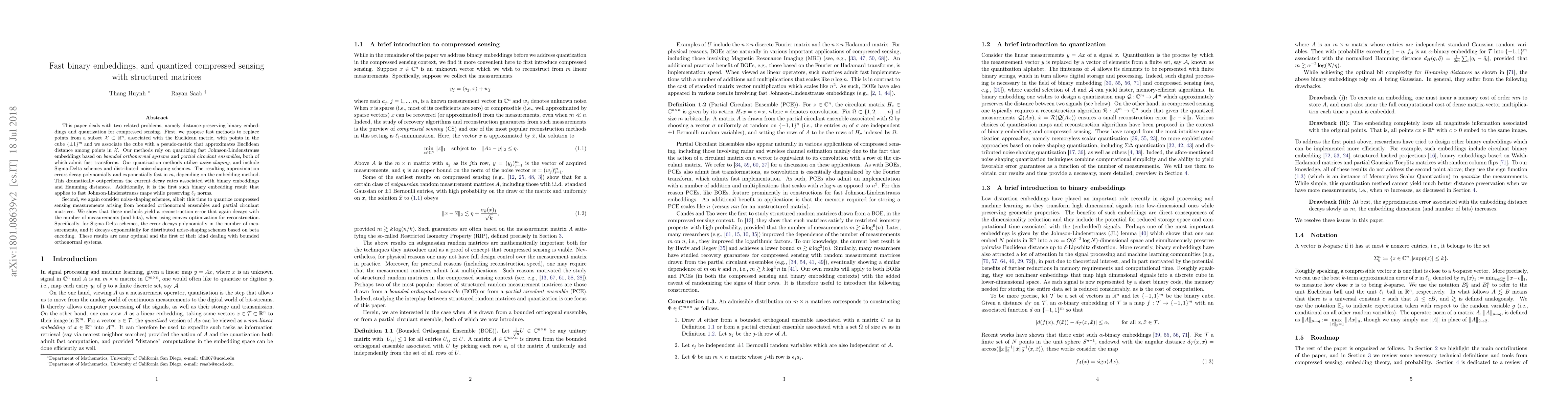 This paper proposes fast methods for binary embeddings that approximate Euclidean distances using pseudo-metrics and quantizes compressed sensing measurements with structured matrices, achieving polynomial and exponential decay in approximation errors. The methods leverage noise-shaping and fast transforms for both embedding and compressed sensing.