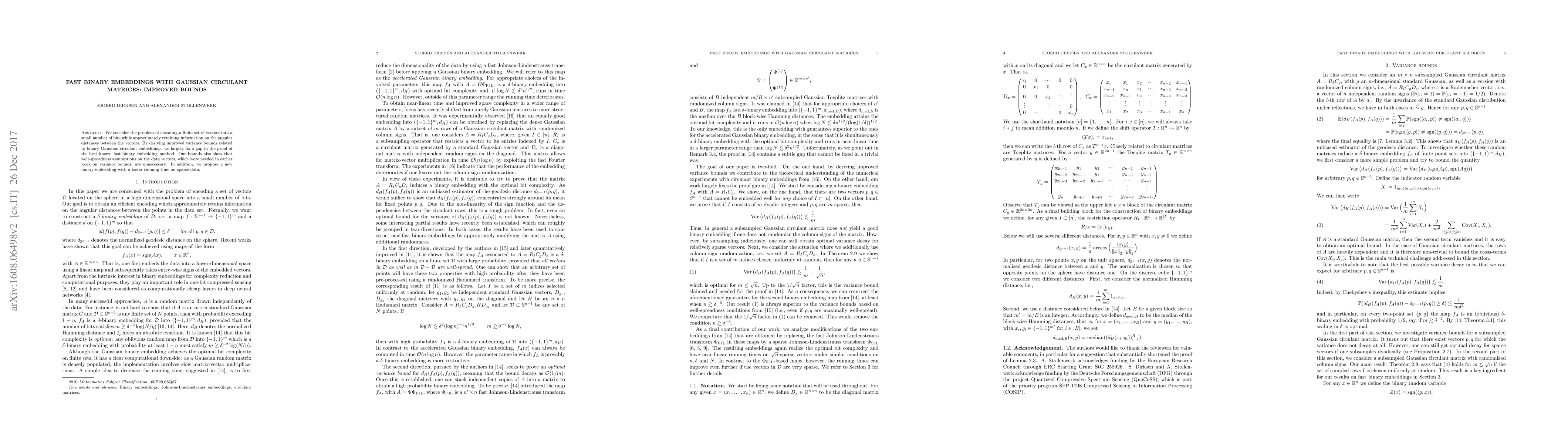 This paper improves variance bounds for binary Gaussian circulant embeddings, addressing a gap in the best known fast binary embedding method, and demonstrates that well-spreadness assumptions are no longer required. The authors also propose a new binary embedding technique that runs faster on sparse data.