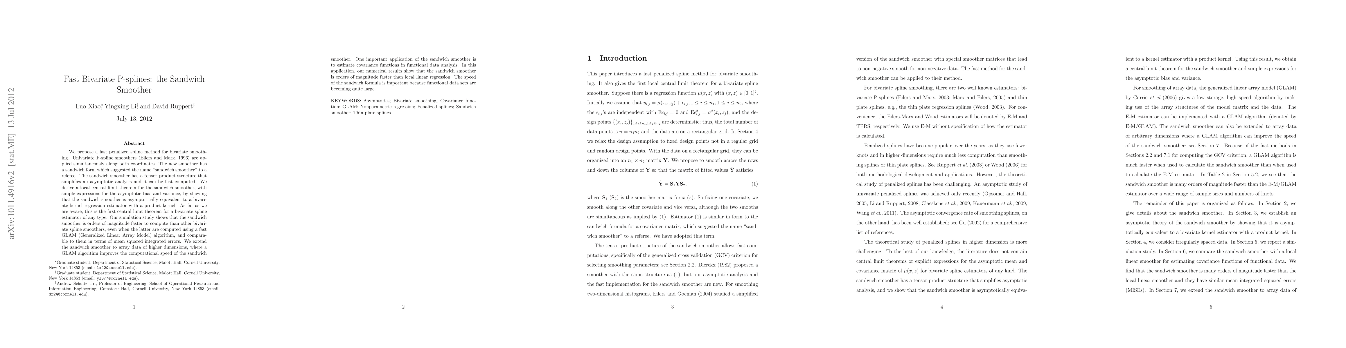 This paper introduces a fast bivariate penalized spline method called the "sandwich smoother," which applies univariate P-spline smoothers along both coordinates. It demonstrates superior computational speed and comparable accuracy to other bivariate spline methods, with applications in estimating covariance functions in functional data analysis.