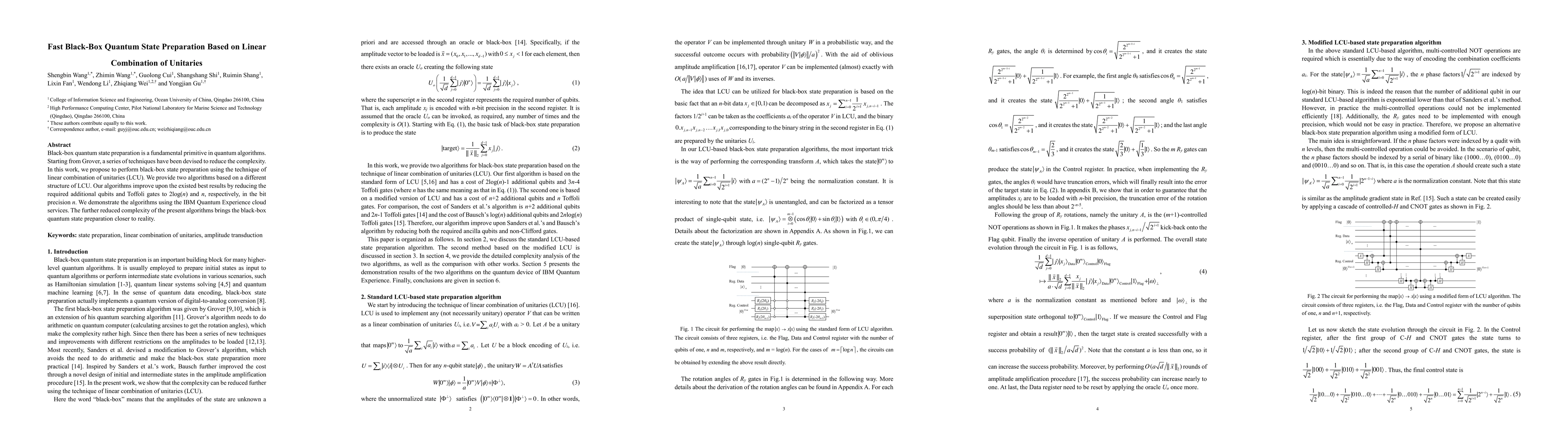 This paper proposes new algorithms for black-box quantum state preparation using linear combination of unitaries (LCU), achieving lower complexity by requiring only 2log(n) additional qubits and n Toffoli gates for bit precision n. The algorithms are demonstrated on IBM Quantum Experience, advancing the practical feasibility of black-box quantum state preparation.