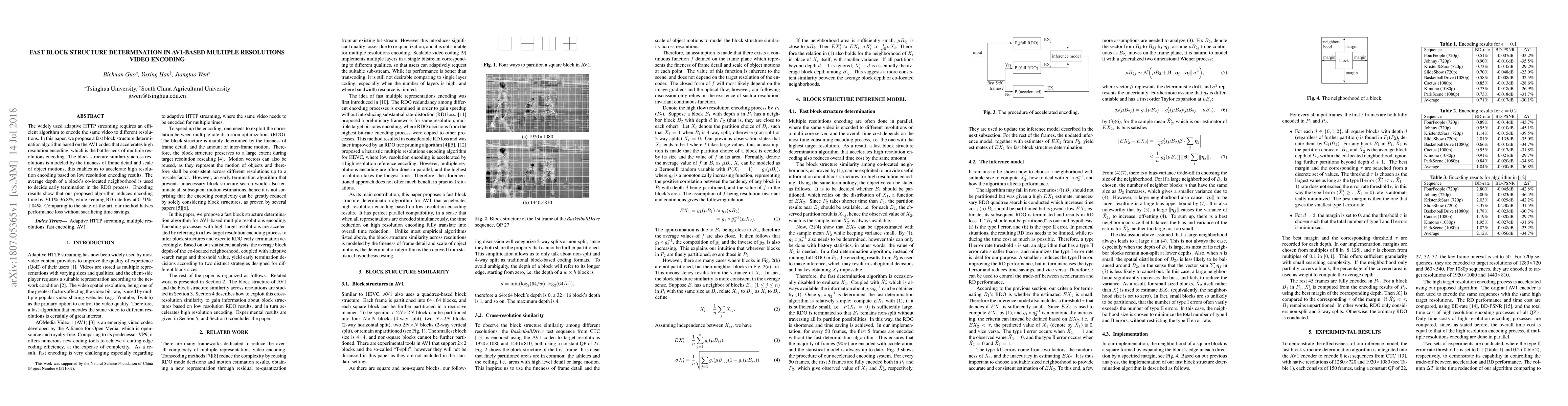 The widely used adaptive HTTP streaming requires an efficient algorithm to encode the same video to different resolutions. In this paper, we propose a fast block structure determination algorithm based on the AV1 codec that accelerates high resolution encoding, which is the bottle-neck of multiple resolutions encoding. The block structure similarity across resolutions is modeled by the fineness of frame detail and scale of object motions, this enables us to accelerate high resolution encoding based on low resolution encoding results. The average depth of a block's co-located neighborhood is used to decide early termination in the RDO process. Encoding results show that our proposed algorithm reduces encoding time by 30.1%-36.8%, while keeping BD-rate low at 0.71%-1.04%. Comparing to the state-of-the-art, our method halves performance loss without sacrificing time savings.