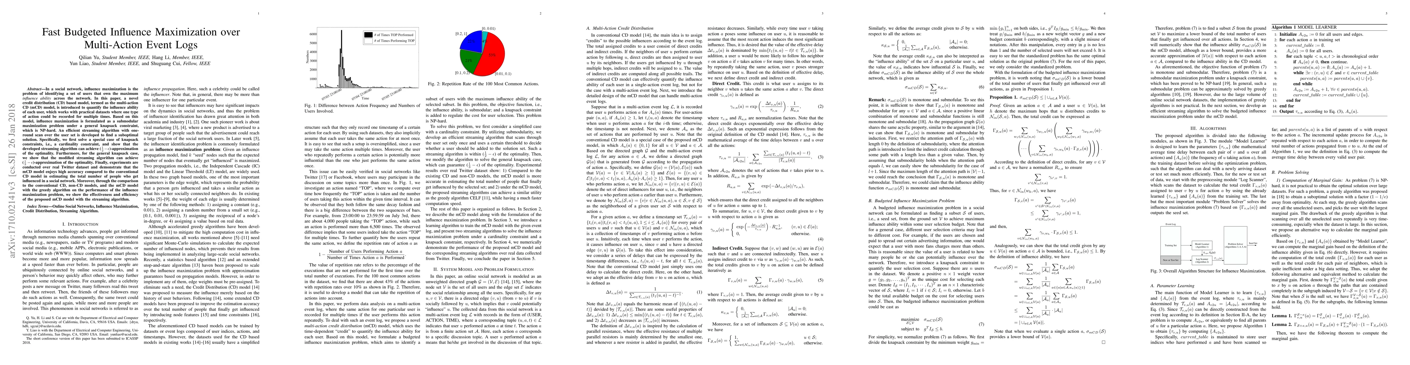This paper introduces a novel multi-action credit distribution model (mCD) to quantify user influence in social networks, framing influence maximization as a submodular optimization problem under knapsack constraints. An efficient streaming algorithm is developed to achieve ($\frac{1}{2}-\epsilon$)-approximation for cardinality constraints and ($\frac{1}{3}-\epsilon$)-approximation for general knapsack constraints, demonstrating high accuracy and effectiveness compared to conventional models.