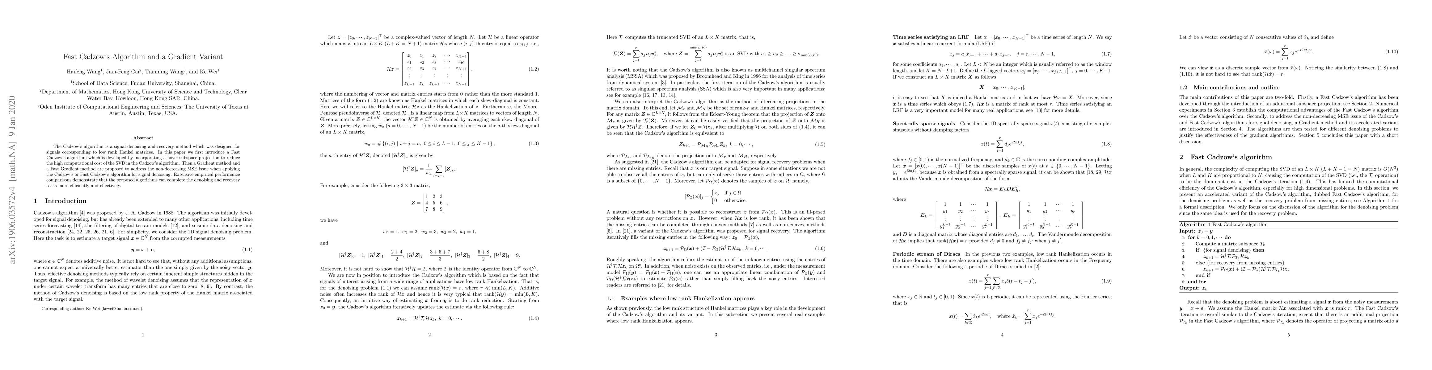 The Cadzow's algorithm is a signal denoising and recovery method which was designed for signals corresponding to low rank Hankel matrices. In this paper we first introduce a Fast Cadzow's algorithm which is developed by incorporating a novel subspace projection to reduce the high computational cost of the SVD in the Cadzow's algorithm. Then a Gradient method and a Fast Gradient method are proposed to address the non-decreasing MSE issue when applying the Cadzow's or Fast Cadzow's algorithm for signal denoising. Extensive empirical performance comparisons demonstrate that the proposed algorithms can complete the denoising and recovery tasks more efficiently and effectively.