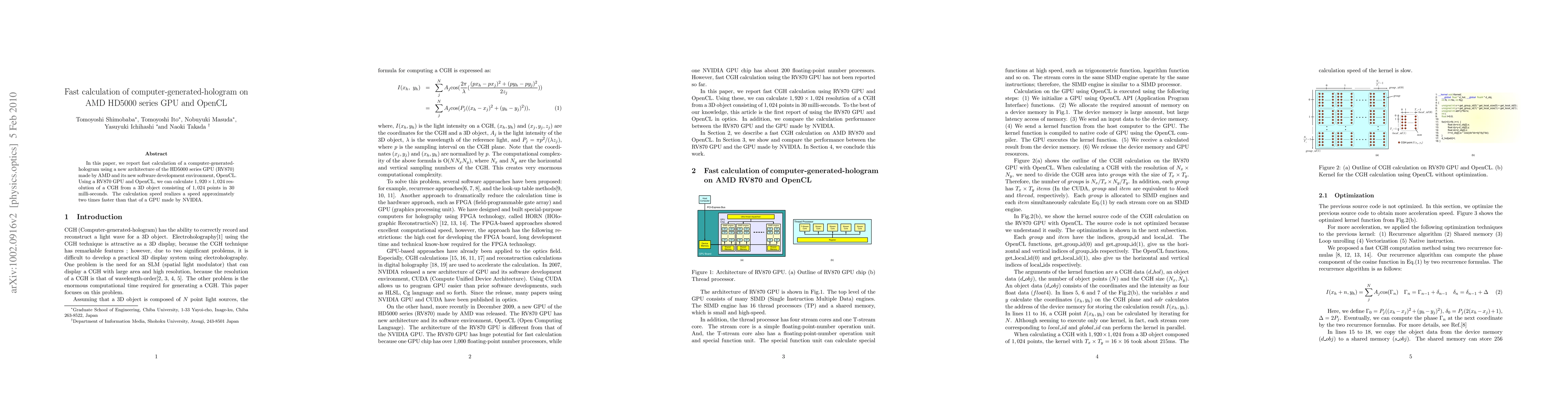 This paper presents a method for rapidly computing computer-generated holograms (CGH) using an AMD HD5000 series GPU (RV870) and OpenCL. The RV870 GPU and OpenCL achieve a 1,920 * 1,024 resolution CGH from a 3D object in 30 milliseconds, nearly doubling the speed of comparable NVIDIA GPUs.