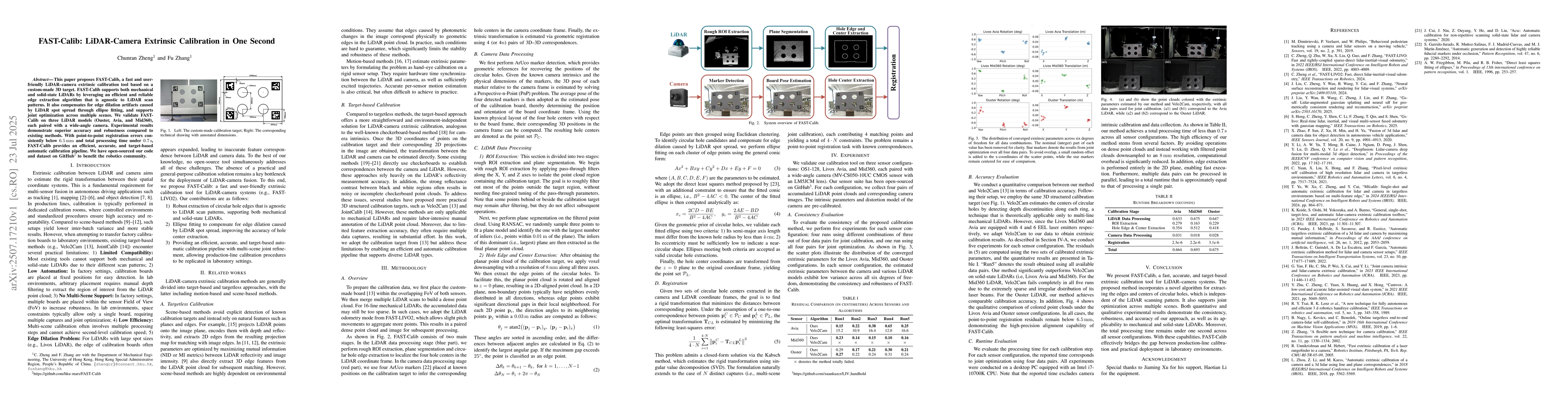 FAST-Calib is a rapid LiDAR-camera calibration tool using a 3D target, working with various LiDAR models. It ensures high accuracy (<6.5mm error) and completeness (0.7s processing time) through efficient edge extraction and ellipse fitting, outperforming existing methods. The method and dataset are open-sourced for the robotics community.