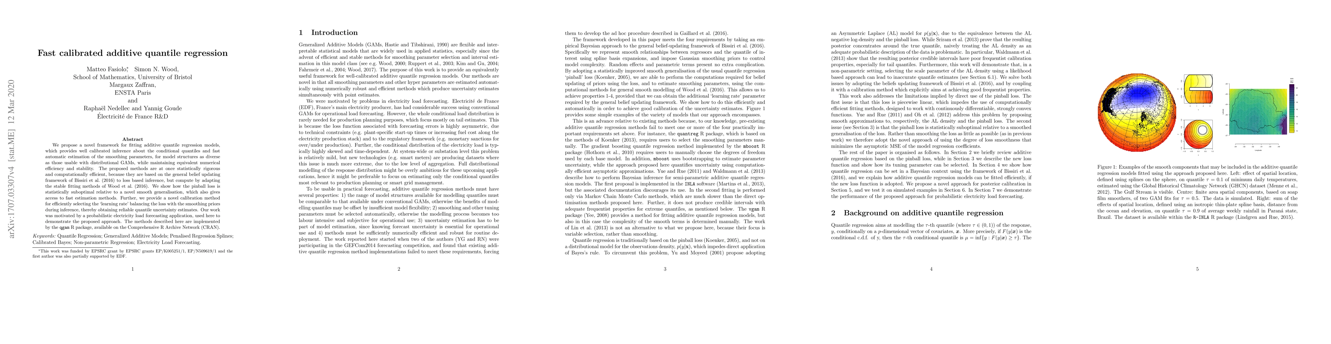 This paper introduces a fast calibrated additive quantile regression framework that efficiently estimates smoothing parameters and provides well-calibrated inference for conditional quantiles, leveraging a novel smooth generalization of the pinball loss and a new calibration method for learning rate selection. The approach is demonstrated through probabilistic electricity load forecasting.