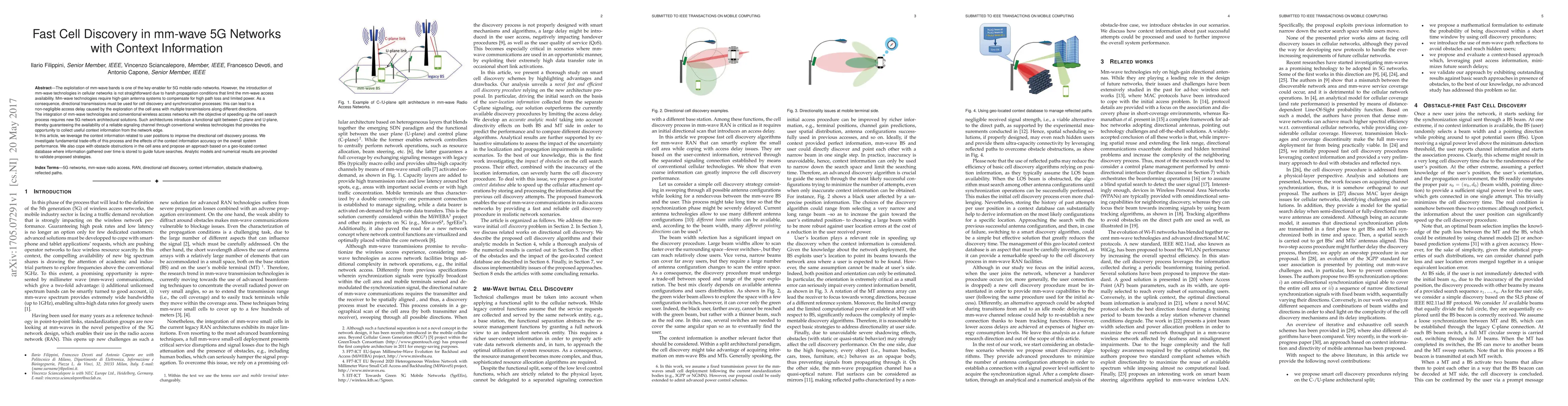This paper explores fast cell discovery in mm-wave 5G networks by leveraging context information, such as user positions, to enhance directional transmissions. It proposes a geo-located context database to guide searches and analyzes the impact of context information accuracy on system performance, providing analytic models and numerical results to validate the strategies.