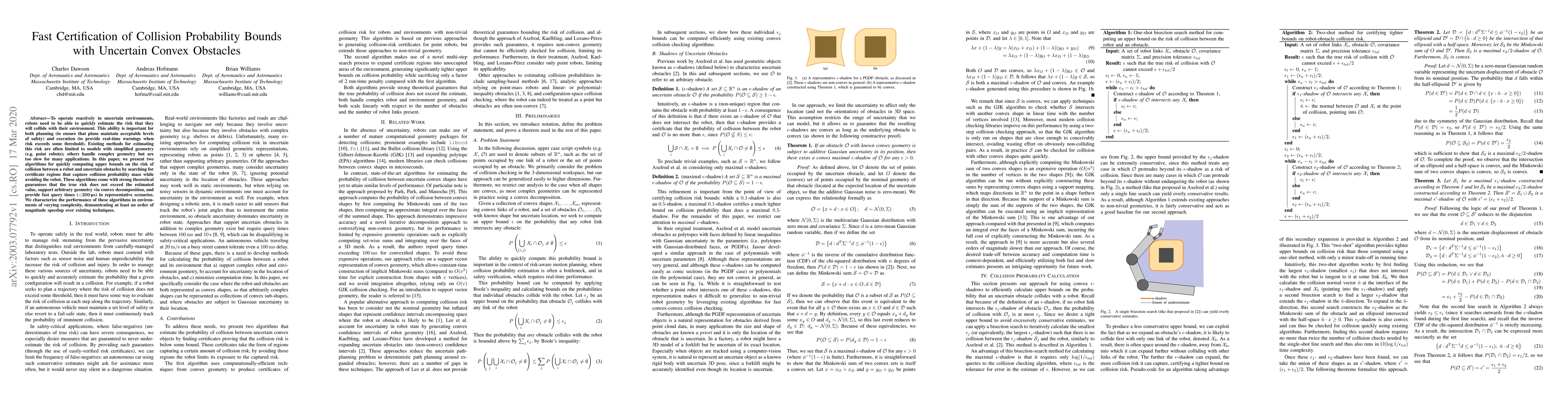 Researchers developed two algorithms to quickly estimate a robot's collision risk with uncertain obstacles, achieving an order of magnitude speedup over existing methods.