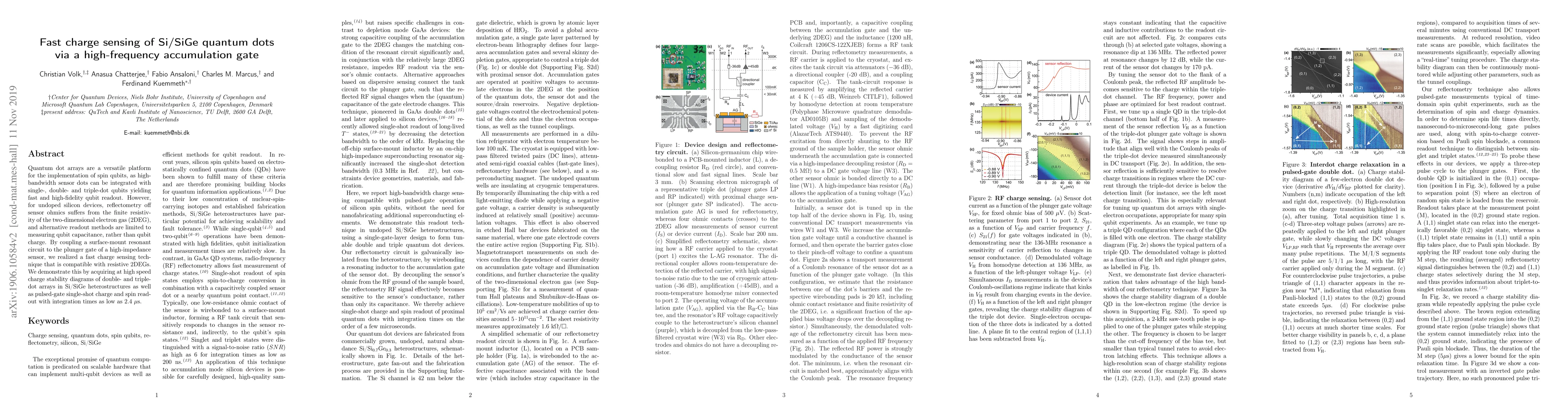 This paper presents a high-frequency accumulation gate technique for fast charge sensing in Si/SiGe quantum dot arrays, enabling high-fidelity qubit readout despite the finite resistivity of the 2DEG. The method couples a resonant circuit to the plunger gate, achieving single-shot charge and spin readout with integration times as low as 2.4 µs.