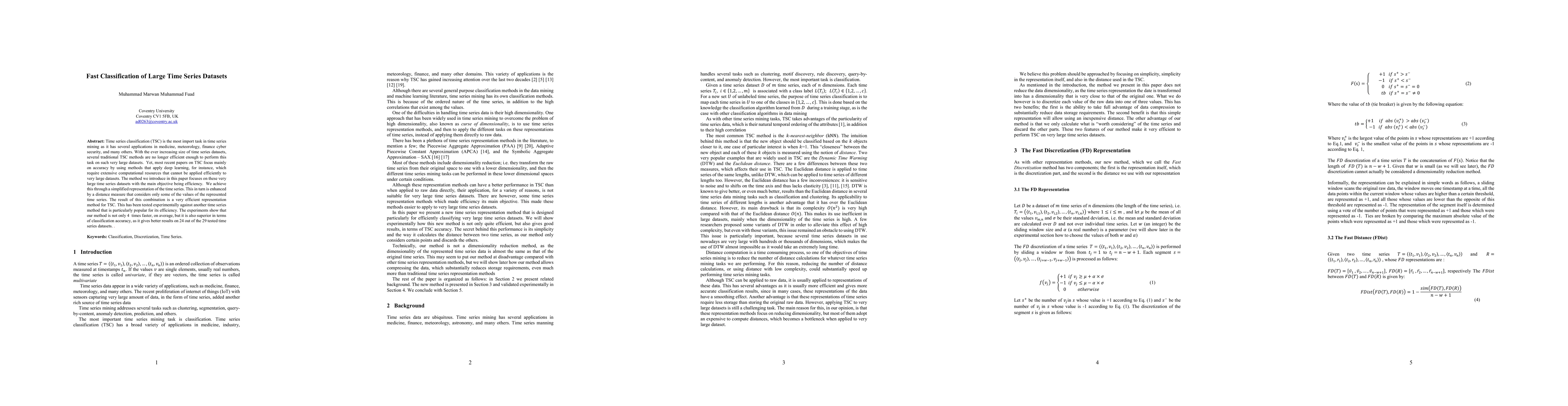 This paper introduces an efficient method for classifying large time series datasets by simplifying their representation and using a selective distance measure, achieving four times faster performance and superior accuracy on 24 out of 29 tested datasets compared to a popular efficient method.