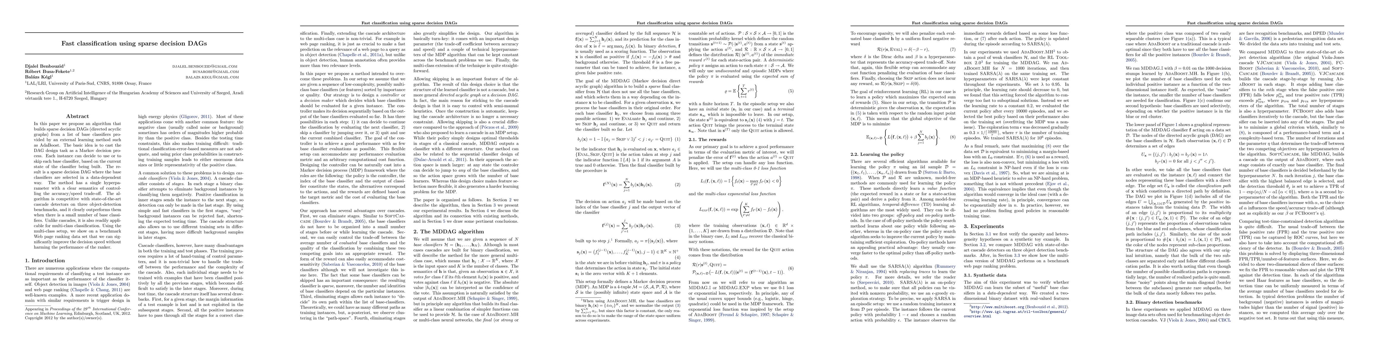 This paper introduces an algorithm for constructing sparse decision DAGs from base classifiers, optimizing them as a Markov decision process to achieve fast classification. The method effectively balances accuracy and speed, outperforming state-of-the-art cascade detectors, especially with fewer classifiers, and is also applicable for multi-class classification.