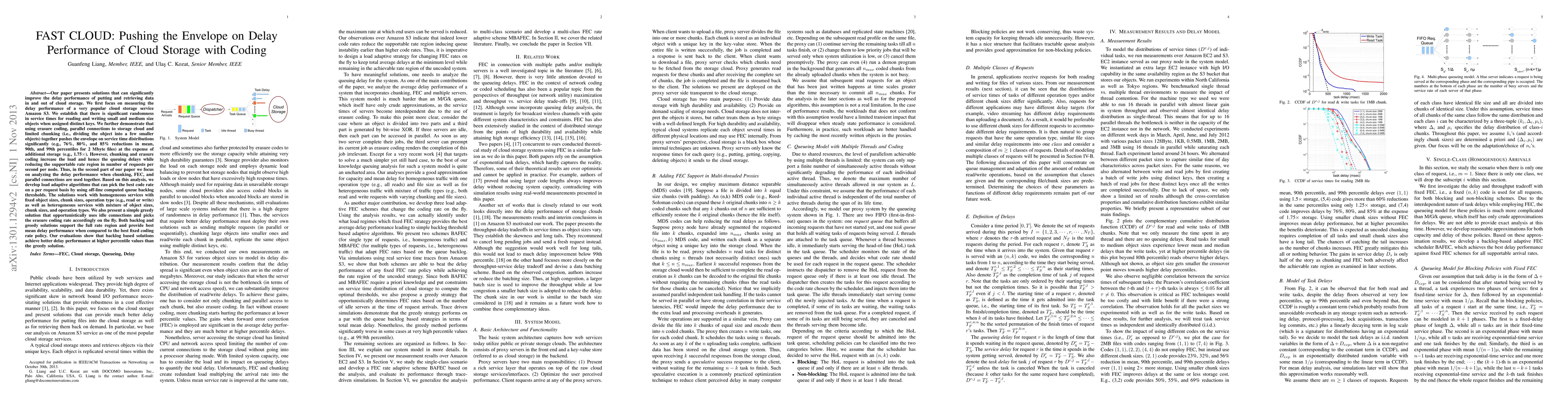 This paper investigates methods to enhance delay performance in cloud storage, particularly for Amazon S3. It demonstrates significant improvements using erasure coding, parallel connections, and chunking, achieving up to 85% reduction in service time percentiles but at the cost of increased storage. The paper also develops adaptive algorithms to optimize coding rates based on queue backlog, showing better performance compared to fixed coding rates.