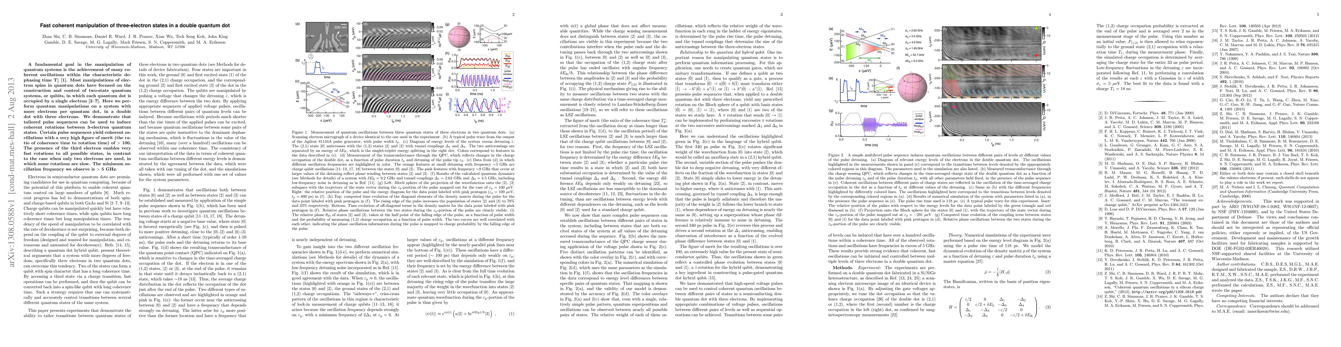This paper demonstrates the coherent manipulation of three-electron states within a double quantum dot using tailored pulse sequences, achieving high-speed rotations and oscillations exceeding 5 GHz with a notable figure of merit greater than 100. The third electron enhances the speed of rotations compared to systems with only two electrons.