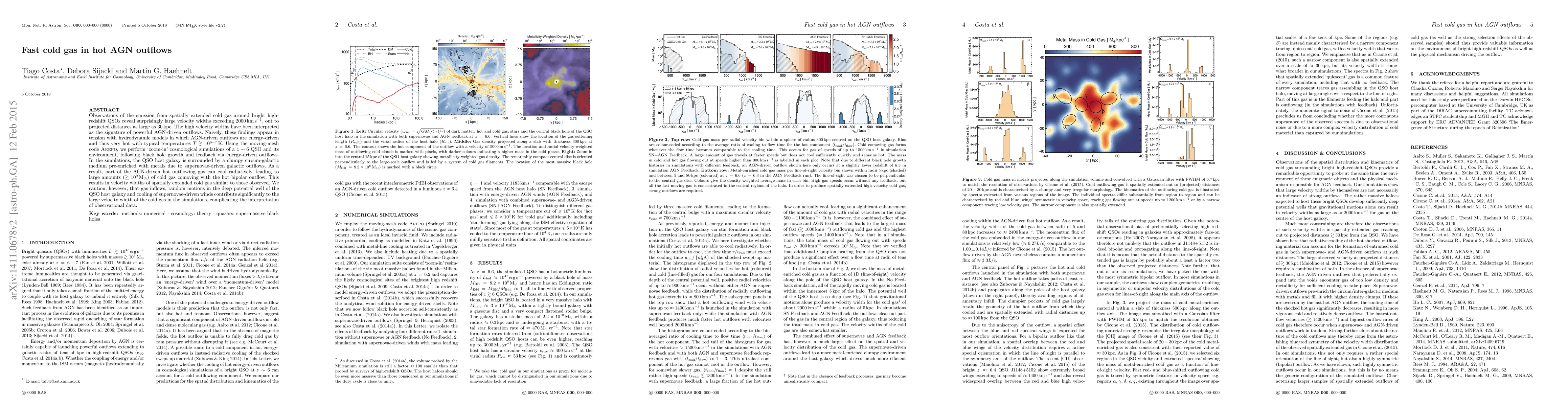 This paper investigates the presence of fast cold gas in AGN outflows around high-redshift QSOs using cosmological simulations. The findings suggest that radiative cooling of energy-driven hot outflows can produce large amounts of cold gas, explaining observed velocity widths, though other factors like gas inflows and supernovae winds also contribute.