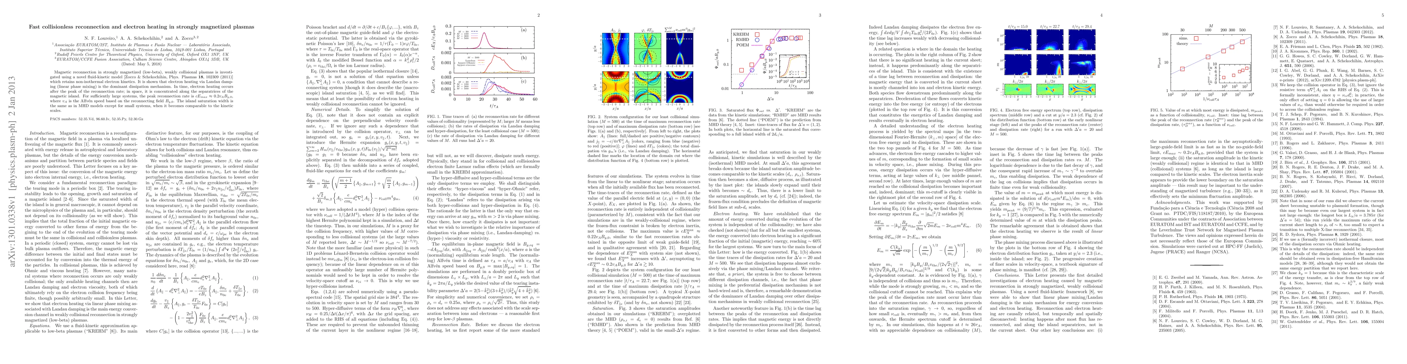 This paper explores magnetic reconnection in low-beta, weakly collisional plasmas using a fluid-kinetic model, revealing that electron heating through Landau damping is the main dissipation mechanism. The peak reconnection rate is found to be approximately 0.2 times the Alfv\'en speed based on the reconnecting field, with electron heating concentrated along the separatrices.