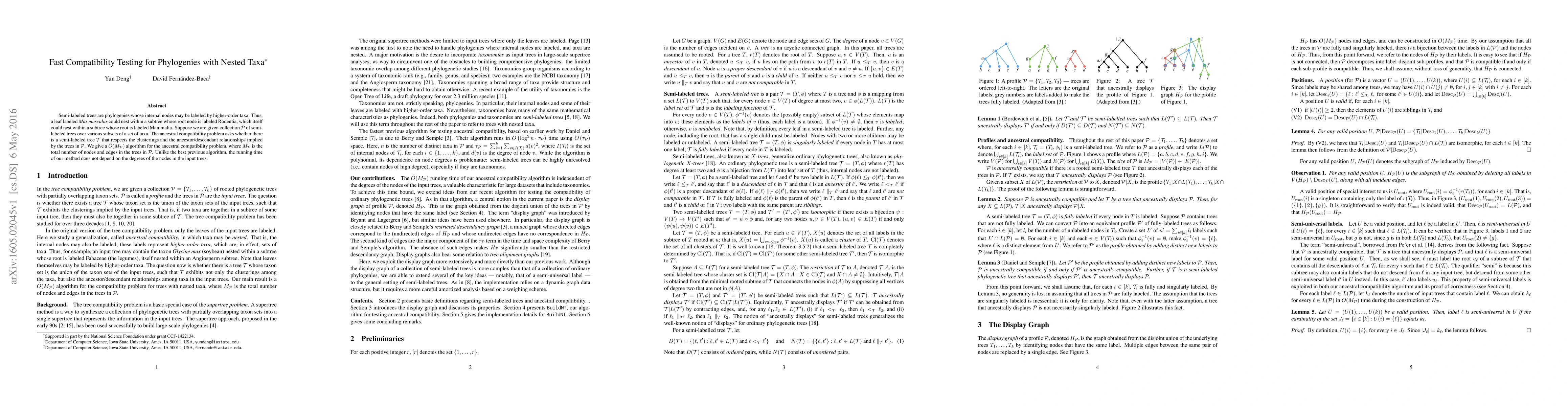 Semi-labeled trees are phylogenies whose internal nodes may be labeled by higher-order taxa. Thus, a leaf labeled Mus musculus could nest within a subtree whose root node is labeled Rodentia, which itself could nest within a subtree whose root is labeled Mammalia. Suppose we are given collection $\mathcal P$ of semi-labeled trees over various subsets of a set of taxa. The ancestral compatibility problem asks whether there is a semi-labeled tree $\mathcal T$ that respects the clusterings and the ancestor/descendant relationships implied by the trees in $\mathcal P$. We give a $\tilde{O}(M_{\mathcal{P}})$ algorithm for the ancestral compatibility problem, where $M_{\mathcal{P}}$ is the total number of nodes and edges in the trees in $\mathcal P$. Unlike the best previous algorithm, the running time of our method does not depend on the degrees of the nodes in the input trees.