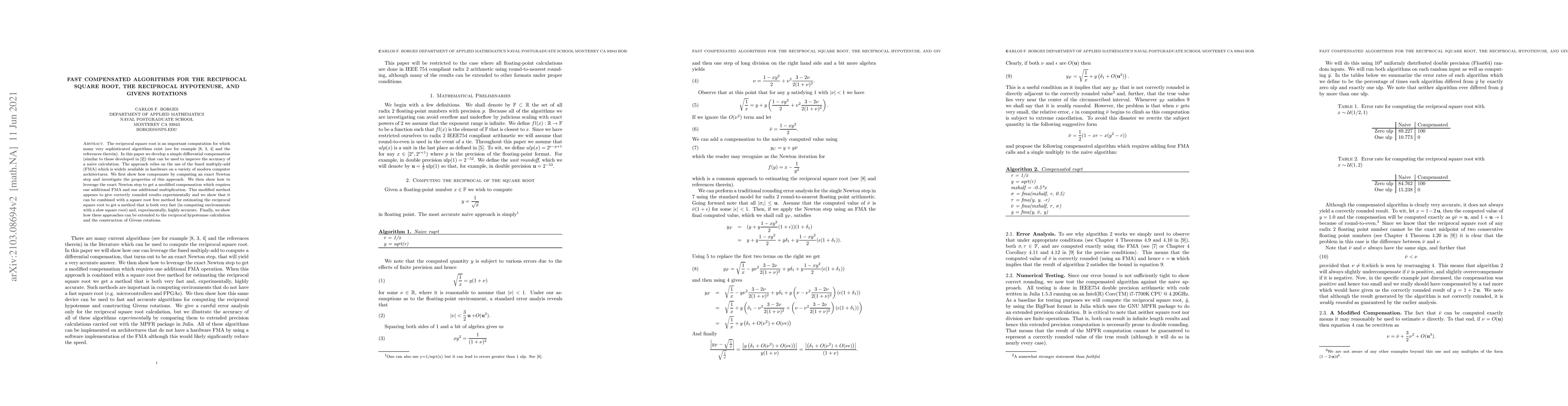 The reciprocal square root is an important computation for which many very sophisticated algorithms exist (see for example \cite{863046,863031} and the references therein). In this paper we develop a simple differential compensation (much like those developed in \cite{borges}) that can be used to improve the accuracy of a naive calculation. The approach relies on the use of the fused multiply-add (FMA) which is widely available in hardware on a variety of modern computer architectures. We then demonstrate how to combine this approach with a somewhat inaccurate but fast square root free method for estimating the reciprocal square root to get a method that is both fast (in computing environments with a slow square root) and, experimentally, highly accurate. Finally, we show how this same approach can be extended to the reciprocal hypotenuse calculation and, most importantly, to the construction of Givens rotations.