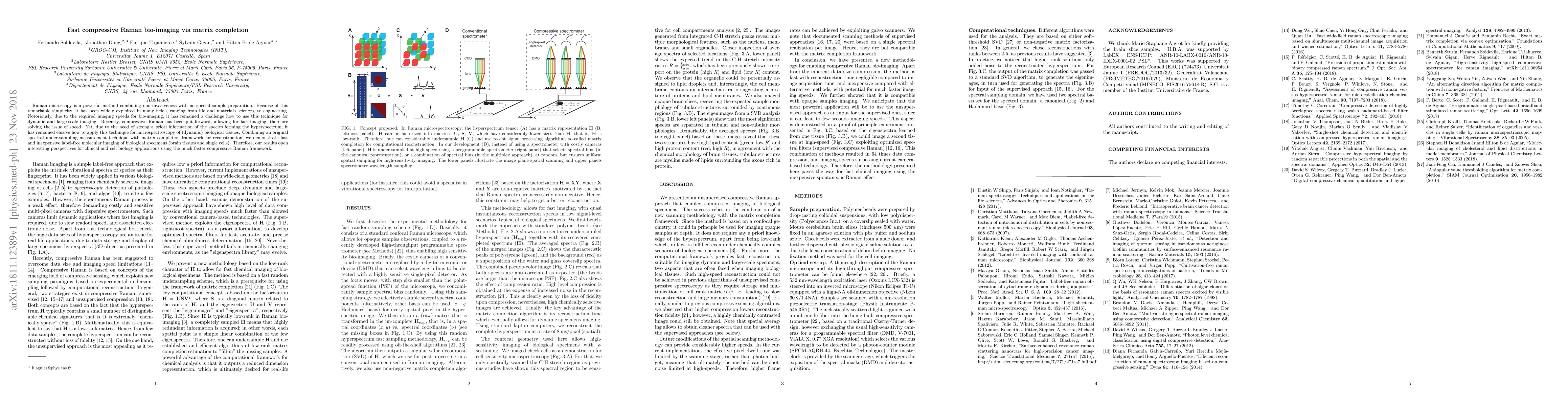 This paper presents a method for fast compressive Raman bio-imaging using matrix completion to reconstruct high-speed, label-free molecular images of biological tissues. The approach enables dynamic and large-scale imaging of brain tissues and single cells, offering potential for clinical and cell biology applications.