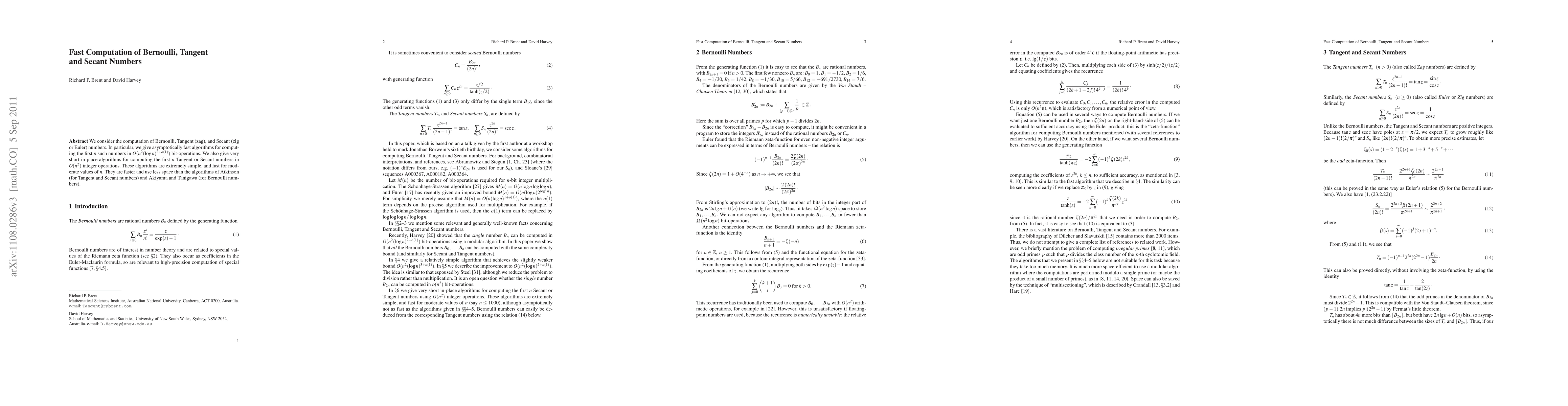 This paper presents efficient algorithms for computing Bernoulli, Tangent, and Secant numbers, achieving O(n^2.(log n)^(2+o(1))) bit-operations for the first n numbers and O(n^2) integer operations for Tangent and Secant numbers. These methods are simpler and more space-efficient than previous algorithms.