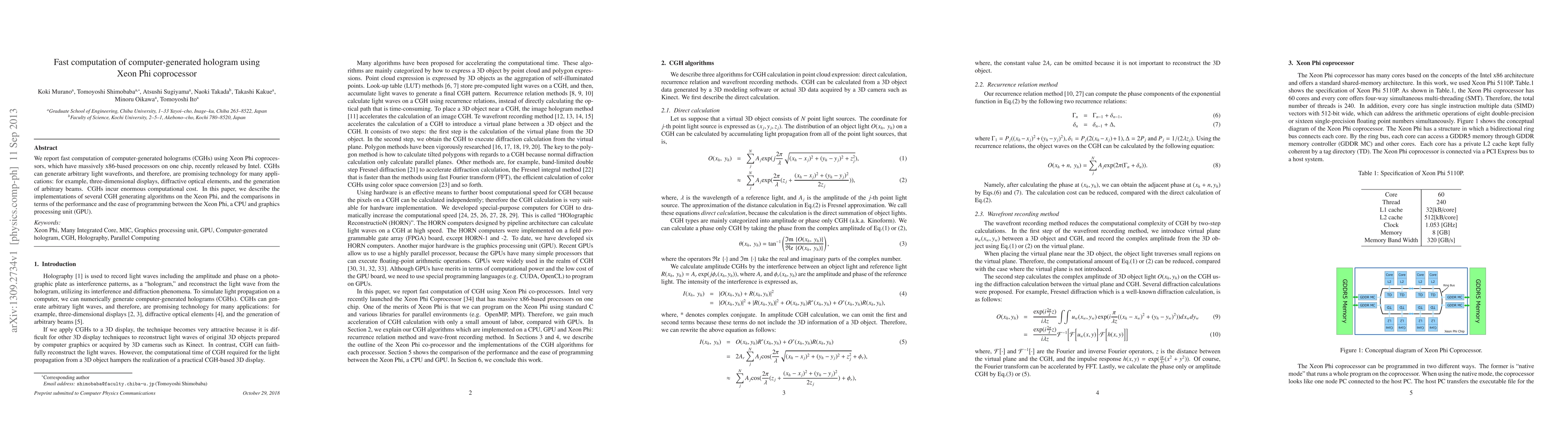 This paper presents fast computation of computer-generated holograms (CGHs) using Intel's Xeon Phi coprocessors, comparing their performance and programming ease against traditional CPUs and GPUs. The study highlights the potential of Xeon Phi for applications like 3D displays and diffractive optical elements due to its significant computational efficiency.