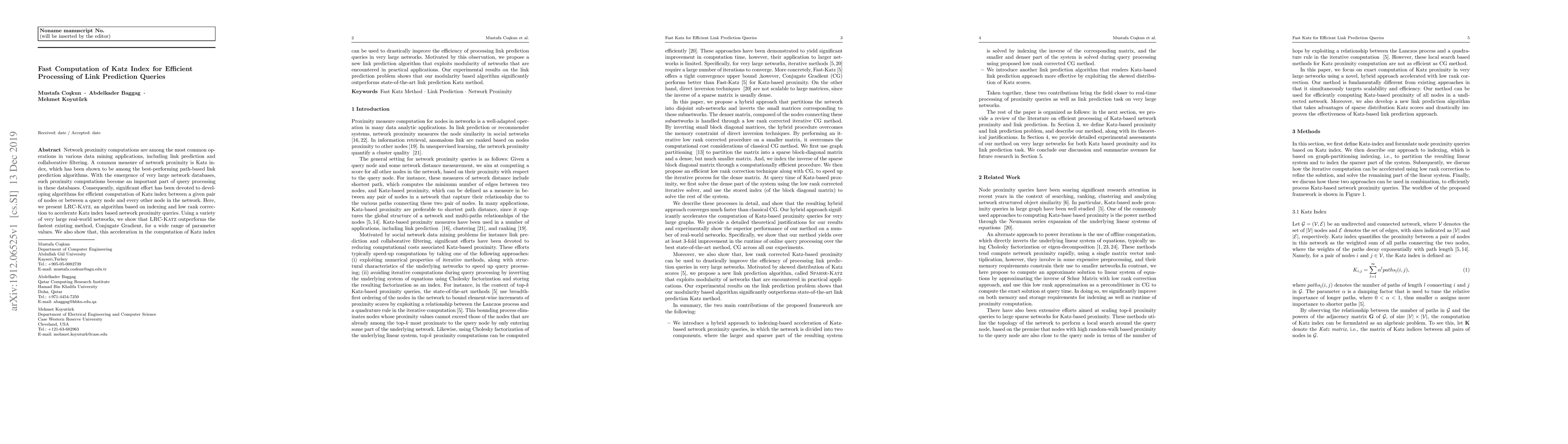 A new algorithm called LRC-Katz accelerates the computation of Katz index for network proximity queries, outperforming existing methods on large-scale networks, and also improves link prediction efficiency.