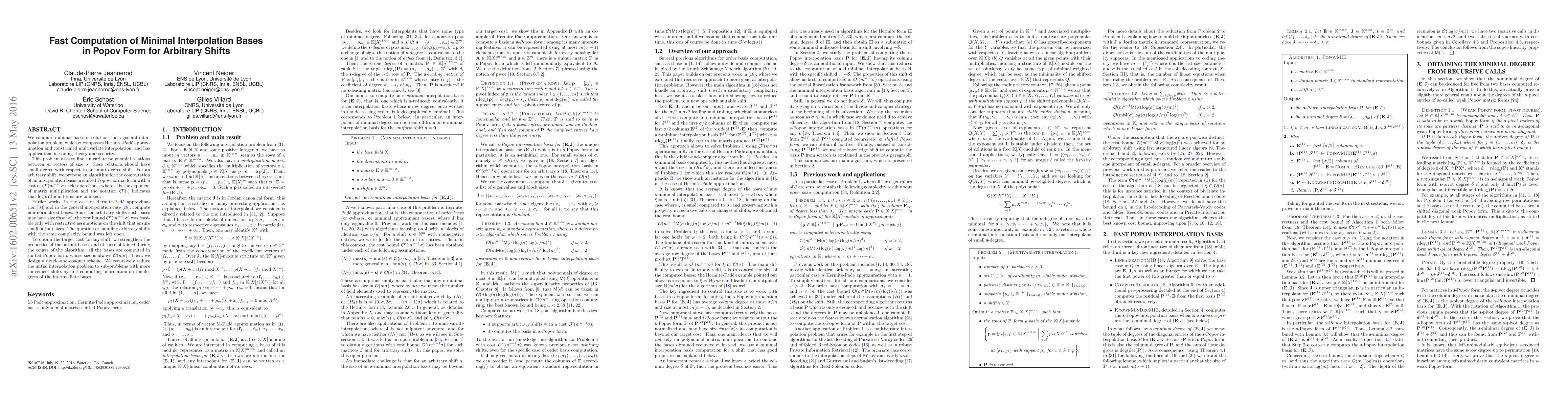 We compute minimal bases of solutions for a general interpolation problem, which encompasses Hermite-Pad\'e approximation and constrained multivariate interpolation, and has applications in coding theory and security. This problem asks to find univariate polynomial relations between $m$ vectors of size $\sigma$; these relations should have small degree with respect to an input degree shift. For an arbitrary shift, we propose an algorithm for the computation of an interpolation basis in shifted Popov normal form with a cost of $\mathcal{O}\tilde{~}(m^{\omega-1} \sigma)$ field operations, where $\omega$ is the exponent of matrix multiplication and the notation $\mathcal{O}\tilde{~}(\cdot)$ indicates that logarithmic terms are omitted. Earlier works, in the case of Hermite-Pad\'e approximation and in the general interpolation case, compute non-normalized bases. Since for arbitrary shifts such bases may have size $\Theta(m^2 \sigma)$, the cost bound $\mathcal{O}\tilde{~}(m^{\omega-1} \sigma)$ was feasible only with restrictive assumptions on the shift that ensure small output sizes. The question of handling arbitrary shifts with the same complexity bound was left open. To obtain the target cost for any shift, we strengthen the properties of the output bases, and of those obtained during the course of the algorithm: all the bases are computed in shifted Popov form, whose size is always $\mathcal{O}(m \sigma)$. Then, we design a divide-and-conquer scheme. We recursively reduce the initial interpolation problem to sub-problems with more convenient shifts by first computing information on the degrees of the intermediate bases.